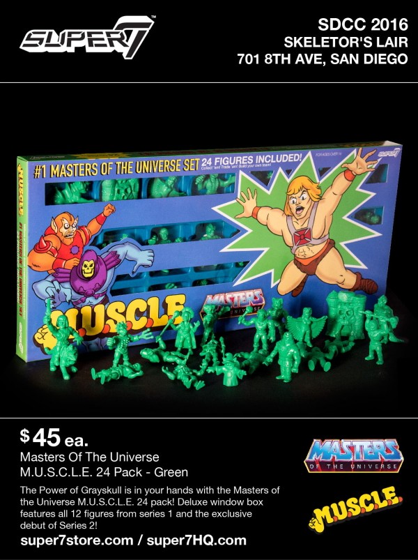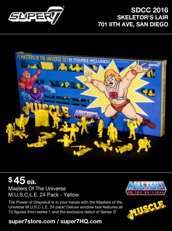 Exclusive packaging and colorways for Wave 1 characters and also the first time anywhere debut of the new Wave 2 M.U.S.C.L.E. figures (He-Man, Stratos, Sorceress, Orko, Fisto, Battle Cat, Grayskull, Skeletor, Evil-Lyn, Kobra Khan, Spikor, and Stinkor).
