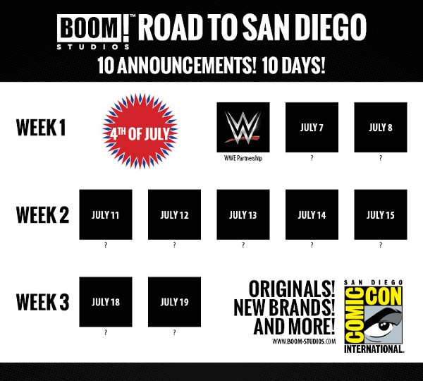 Road to San Diego Announcement #1Our first announcement in the #RoadToSanDiego is out! We have partnered with WWE for new comics! We will launch the initiative at Comic-Con with a set of six, blind-bagged, one-page comics ($5 each, for sale at the BOOM! Studios booth #2229) titled WWE: Then. Now. Forever. Each comic will feature a pin-up image on one side of a different wrestler and a one-page info-comic on the other side that explores that wrestler’s background and history in the ring. Three of these comics will focus on current wrestlers (Now), two on retired favorites (Then), and one on a legendary WWE talent (Forever). A seventh one-page comic will be given out FREE to all attendees of our panel on the WWE comics (see below). Each info-comic is illustrated by Russ Manning Award nominee Daniel Bayliss (Kennel Block Blues,Translucid), colored by Doug Garbark, and lettered by Jim Campbell.