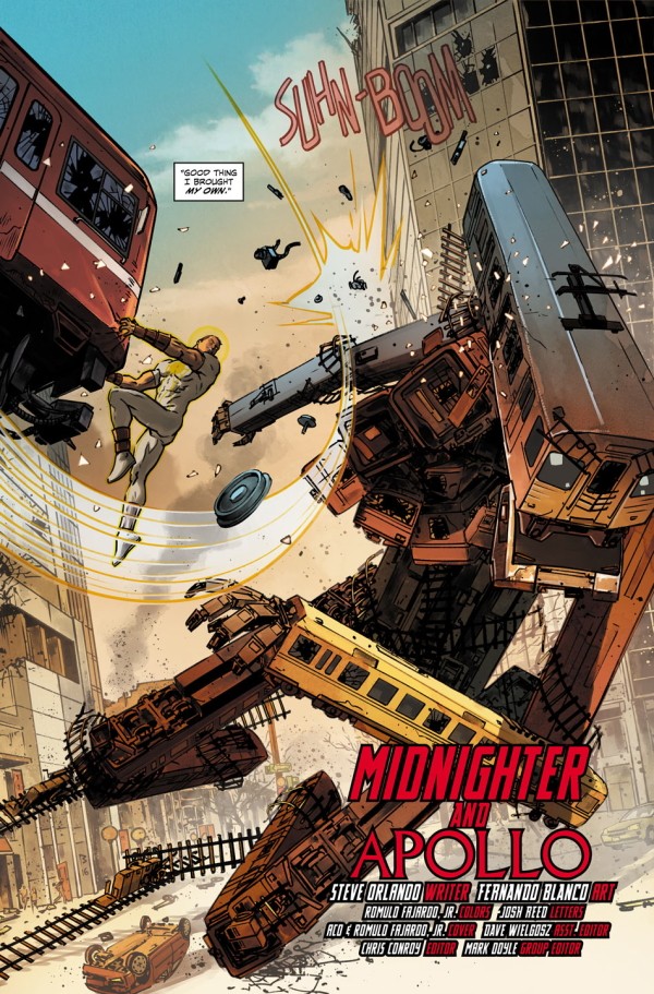 Following up on MIDNIGHTER, one of the best action books of 2015/2016, DC’s new miniseries, MIDNIGHTER AND APOLLO hits back with more explosive, creative, page-bursting action than ever before. From their days as founding members of The Authority, the heroes Midnighter and Apollo have been forever linked both professionally and romantically. On October 5th, they’ll be back, badder than ever, in a six-issue miniseries to continue Midnighter’s story, written by Steve Orlando with art by Fernando Blanco, colors by Romulo Fajardo Jr., letters by Josh Reed and covers by ACO & Fajardo Jr.