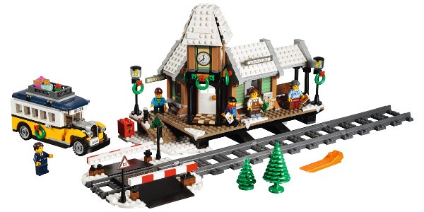 - The festively adorned Winter Village Station features a snowy train station with a clock tower, platform, coffee shop, ticket counter, grade crossing with twin barriers and lights, lampposts, mailbox and green trees, plus a bus.