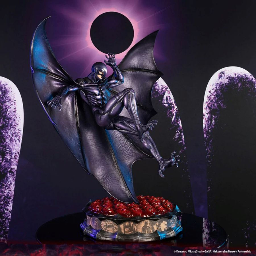The concept for this statue is inspired by the scene in the anime where Griffith transforms into Femto and becomes the fifth member of the God Hand. Crippled and helpless, Griffith succumbs to the temptation of becoming a devil to fulfill his desire of owning a kingdom. He offers his comrades, the Band of the Hawk, as a sacrifice to the apostles during the Eclipse so that his transformation may begin. Now reborn as Femto, he flies and descends in front of Guts, menacing and brimming with evil intent.