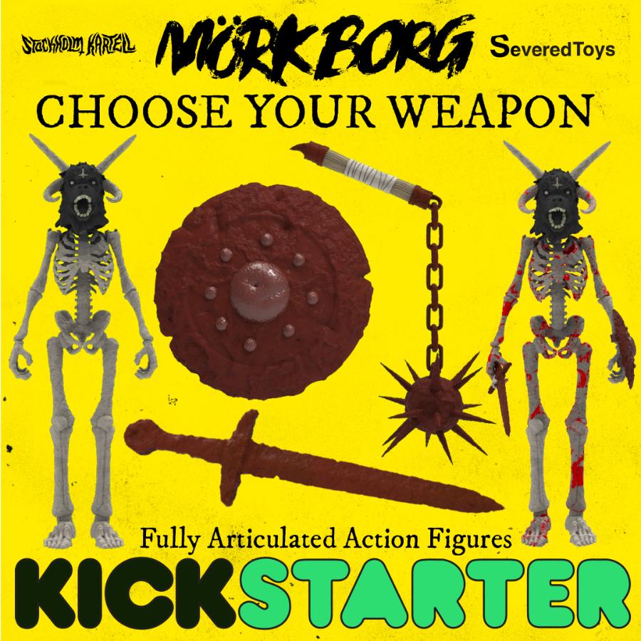 Backers who pledge in the first 48 hours will also get a free exclusive Flanged Mace weapon for their figure. The Kickstarter campaign will have additional weapons packs as stretch goals as well as upgrades to the zine printing, and bonus items like large embroidered patches and tabletop game miniatures. Retail incentives for online shops and brick-and-mortar stores include one free Flanged Mace with each figure on the Kickstarter.