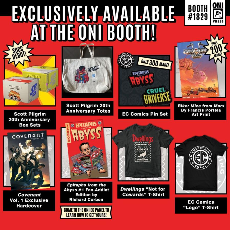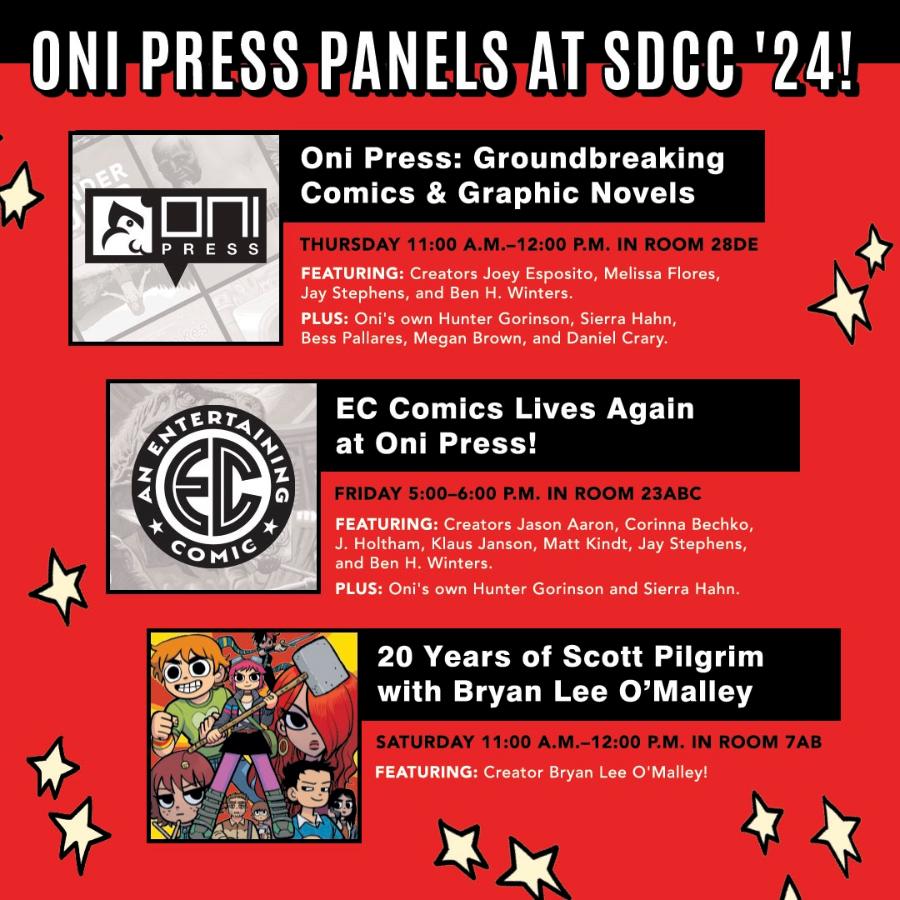Oni Press – the multiple Eisner and Harvey Award-winning publisher of groundbreaking comics and graphic novels since 1997 – is proud a blockbuster slate of special guests, signings, giveaways, exclusives, panels, and more for San Diego Comic-Con 2024! From the 20th anniversary of Bryan Lee O’Malley’s SCOTT PILGRIM and the resurrection of EC Comics in the pages of EPITAPHS FROM THE ABYSS and CRUEL UNIVERSE and the breakout success of Brenna Thummler’s LIGHTS and Jay Stephens’ DWELLINGS, join Oni Press from Wednesday, July 25th through Sunday, July 28th at Booth #1829 to meet your favorite creators and shop a massive array of comics, graphic novels, and SDCC-only exclusives!