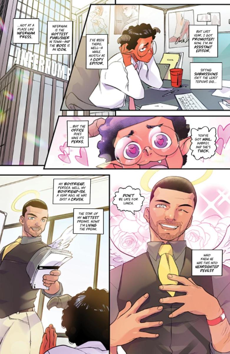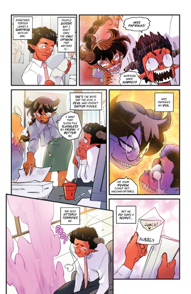Produced by Arancia Studio/The Orangery, the Italian creative atelier that worked on Andolfo’s bestselling Image Comics titles and many successful books (including the 2023 Eisner Award-nominated series Traveling to Mars), Sweet Paprika: Open For Business follows Aubrey Jean, a young employee at Infernum Press, as he tries to impress his hero and boss, Miss Paprika, and figure out his relationship with Persica, a friend with benefits who might want to be more. But just as Aubrey and Persica settle into an open relationship that’s comfortable for them both, their relationship is thrown into turmoil by Kren. And on top of all that, Aubrey finally gets a chance to prove his worth to Miss Paprika by becoming the handler for Infernum Press’s most challenging client—the dreaded, eccentric, and unstable author known as Durian.