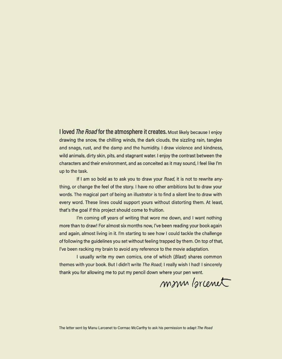 Manu Larcenet sent a letter to Cormac McCarthy asking for his permission to adapt The Road. He wrote: