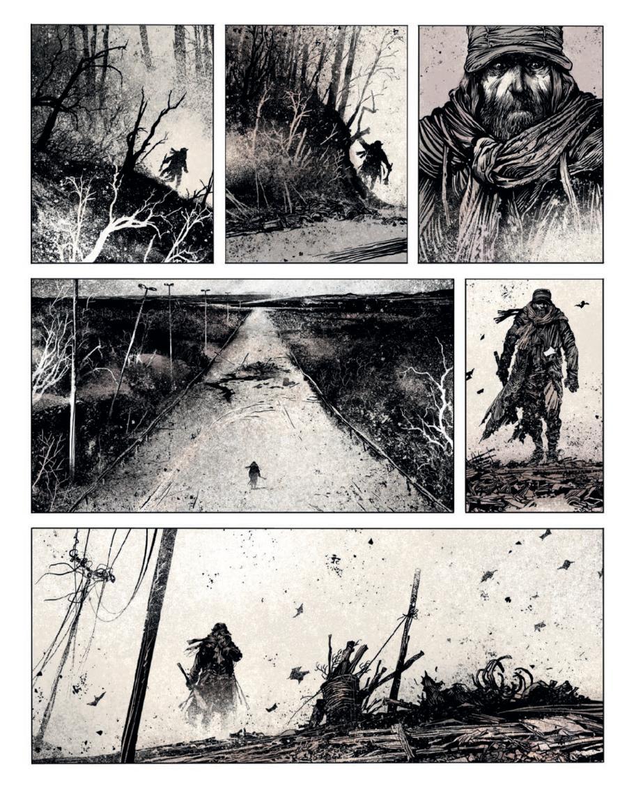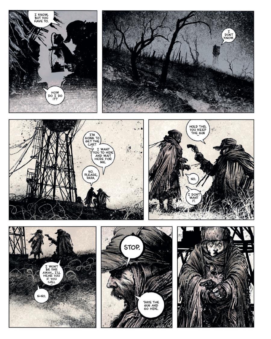 I loved The Road for the atmosphere it creates. Most likely because I enjoy drawing the snow, the chilling winds, the dark clouds, the sizzling rain, tangles and snags, rust, and the damp and the humidity. I draw violence and kindness, wild animals, dirty skin, pits, and stagnant water. I enjoy the contrast between the characters and their environment, and as conceited as it may sound, I feel like I’m up to the task.