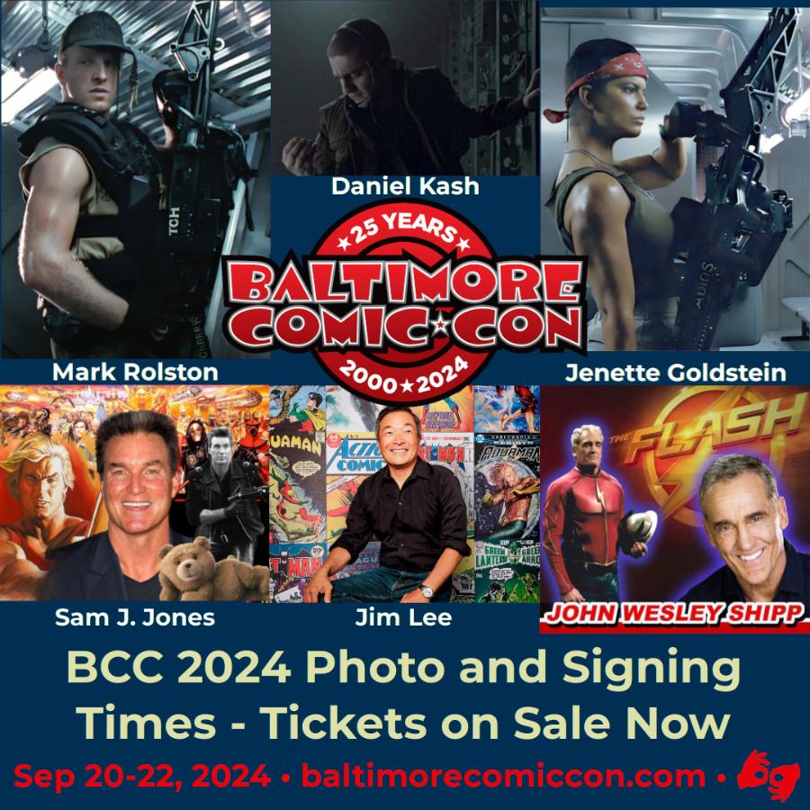 | The 25th anniversary Baltimore Comic-Con will be here in just 3 short days and will be held at the Baltimore Convention Center in Baltimore’s Inner Harbor. We have worked long and hard to make the best schedule we can for you and our guests, and we can now present, in one place, your admission ticket options, your guest signings and panel times, and the details behind our awesome events with Jenette Goldstein, Sam J. Jones, Daniel Kash, Mark Rolston, and John Wesley Shipp, as well as Jim Lee and Leinil Francis Yu. Please note: all schedules are subject to change. Don’t miss out on our many ticket options! |