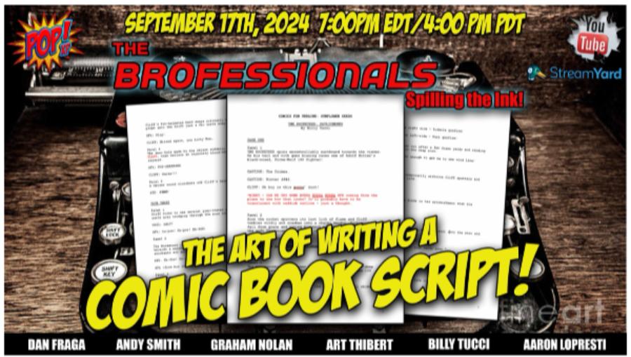 Join Comic Book Superstars, Aaron Lopresti, Andy Smith, Art Thibert, Billy Tucci, Dan Fraga and Graham Nolan on tonight’s “Brofessionals” where they will share a personal insight into the comic book script writing process, including learned do’s, don’ts and the subtle yet substantial differences that are needed to create successful short and long stories.