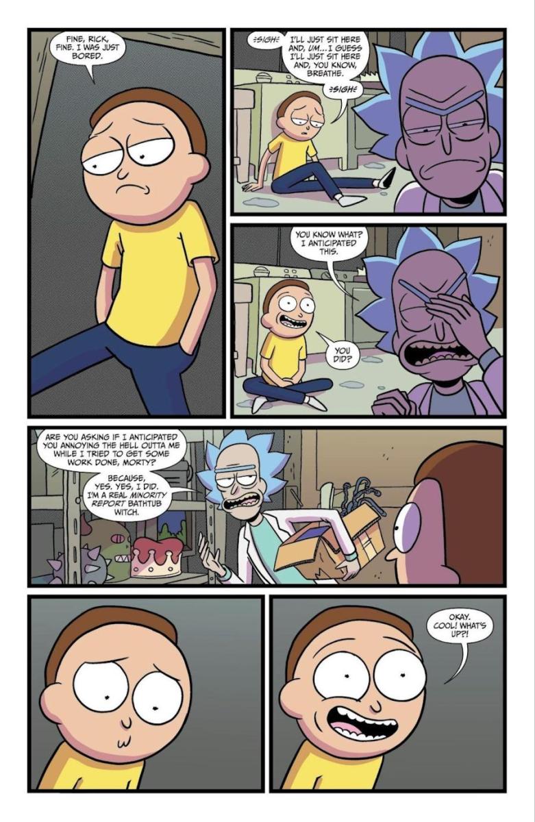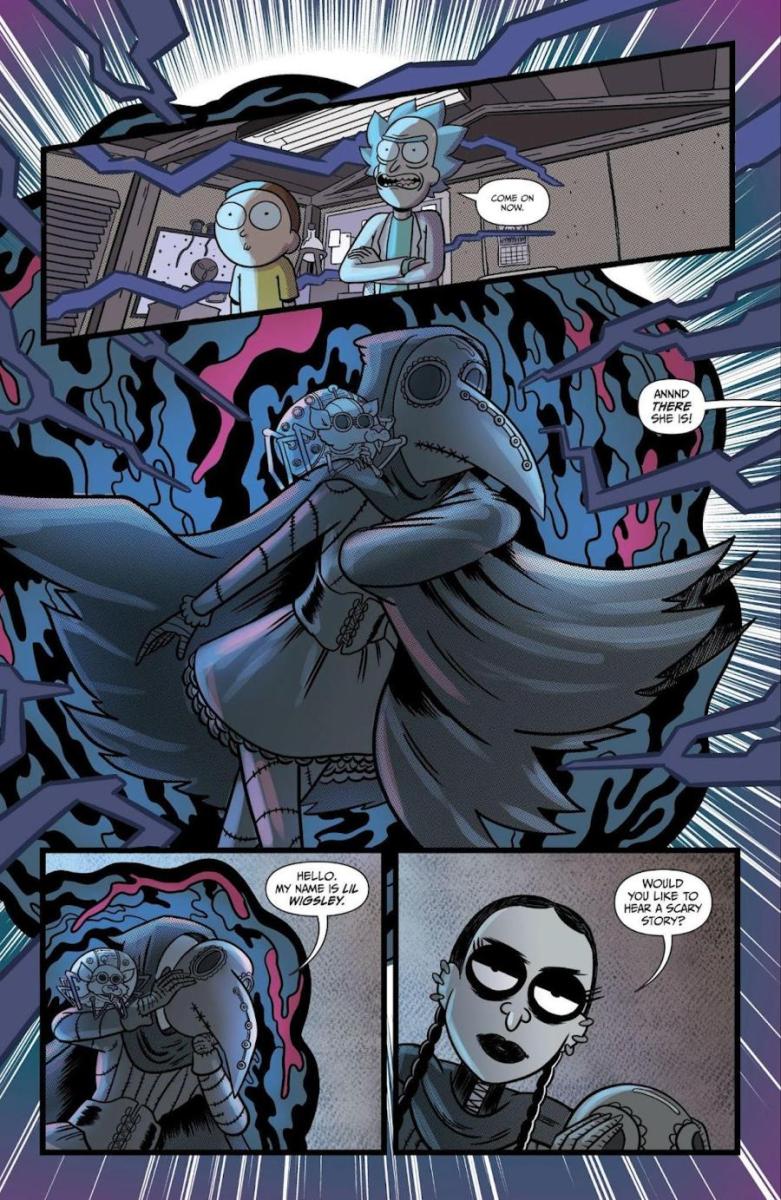 Rick is hard at work in the garage, but Morty just won’t stop yapping, so he opens up a portal and brings in a weird, gothy-looking girl named Lil Wigsley. Rick explains that Lil Wigsley will tell Morty stories if he’ll shut up and listen—but these aren’t just any old stories. They’re horrifically banal, but it soon becomes clear that Rick and Sister Lil Wigsley’s intent to distract Morty is more terrifying than the tepid tales they’ve been spinning!