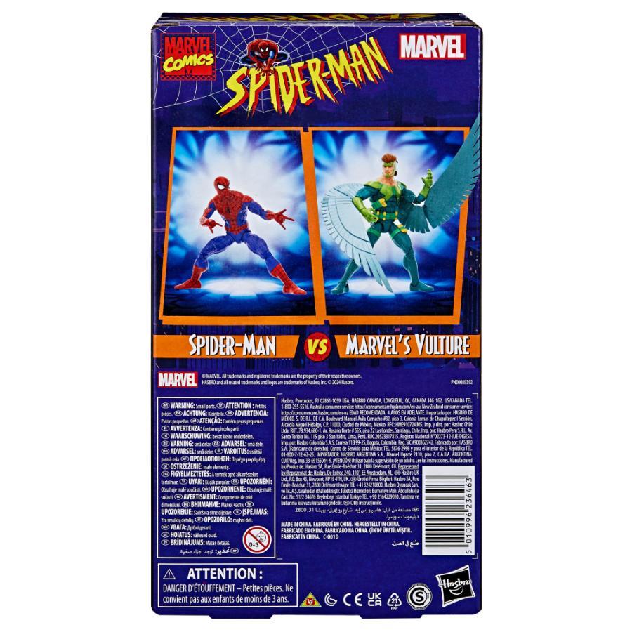 An aging engineer consumed by vanity, Adrian Toomes, a.k.a. Vulture, attempts to steal Spider-Man’s powers — and his youth. Bring the excitement and wonder of the Marvel Universe to your collection with this Hasbro Marvel Legends Spider-Man & Marvel’s Vulture 2-Pack. These collectible 6-inch-scale Marvel figures are detailed to look like Spider-Man & Marvel’s Vulture from the 1994 Spider-Man: The Animated Series. Fans can display this 6-inch action figure set — featuring poseable heads, arms, and legs — in their Marvel action figure collections. Spider-Man includes 2 sets of alternate hands, as well as alternate unmasked Peter Parker and Flash Thompson portrait heads. Marvel’s Vulture features a set of alternate hands, an alternate head, and 4 wing parts. This 2-pack comes in unique vintage-style VHS-themed closed box packaging with series-inspired logos and design.