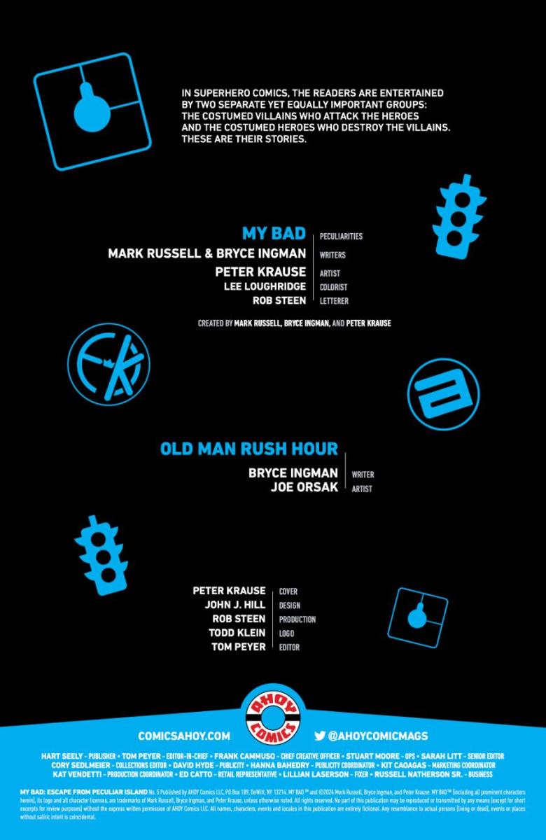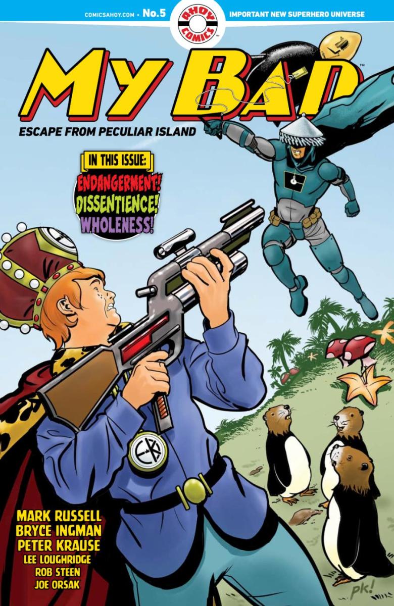 On Wednesday September 25, the outrageously sharp superhero spoof from writers Mark Russell and Bryce Ingman and artist Peter Krause will publish the series finale issue of the crime-fighting, acid-throwing, chandelier-shaking MY BAD: ESCAPE FROM PECULIAR ISLAND #5. Published by AHOY Comics, the independent publisher known for its clever and funny titles like SECOND COMING, THE WRONG EARTH, and JUSTICE WARRIORS, the latest installment of the hilarious series is set in a charmingly absurd universe where the heroes are as incompetent and self-involved as the villains.