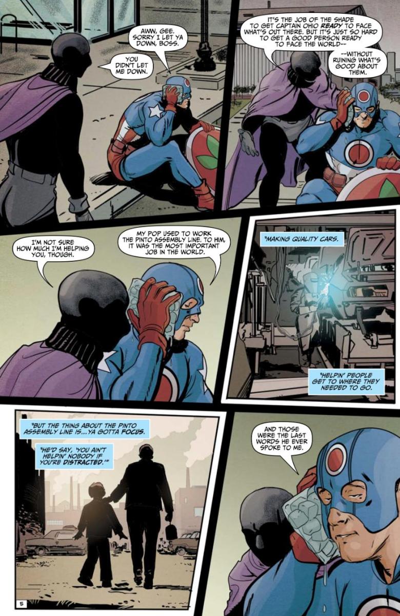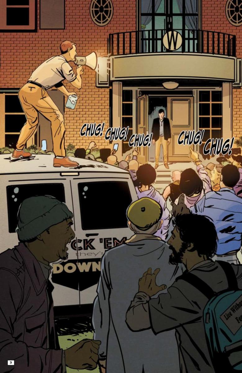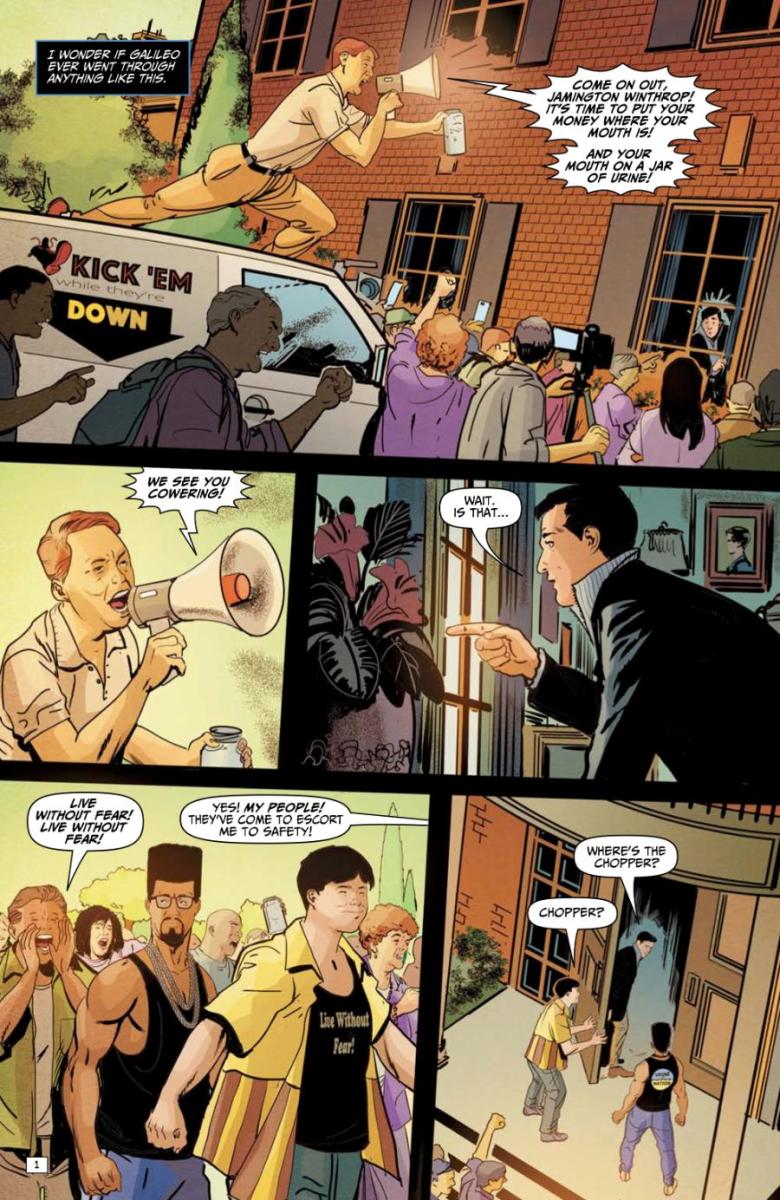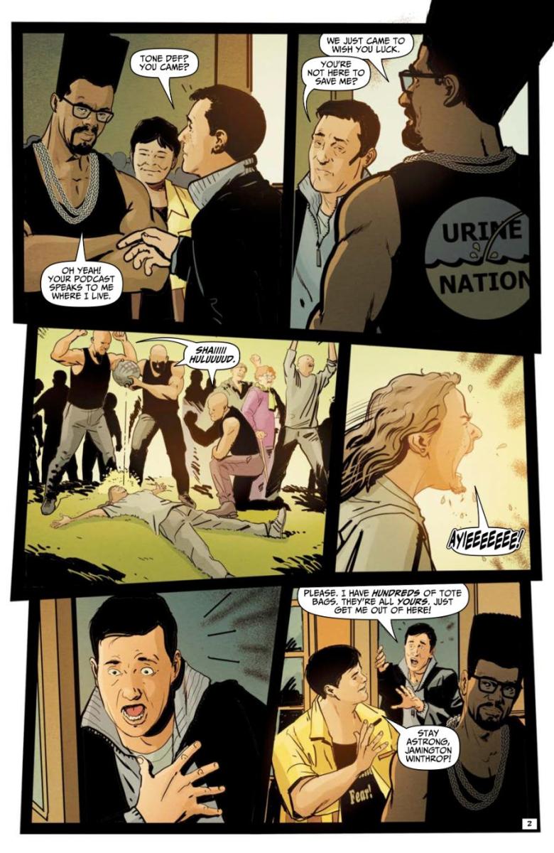 Get in on the ground floor of The Important New Superhero Universe, just in time for the SERIES FINALE! The former crime-fighting Chandelier hits yet a newer, even lower bottom—this one televised! A shrunken Emperor King and Acid Chimp lounge on doll furniture! Rush Hour dedicates a new fried chicken restaurant! Stories will end! Worlds will collide! Beaver-faced penguins will witness, as ever! POW!
