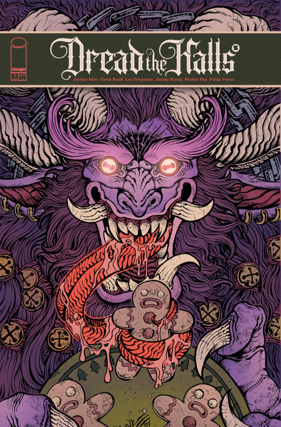 From Image Comics and Syzygy Publishing, co-created and written by Jordan Hart (Ripple Effects, The Cabinet) and Chris Ryall (Zombies vs. Robots), comes Dread The Halls—an extra-length one-shot collection of four not-so-merry tales of terror featuring mesmerizing interior art by Lee Ferguson (“Gone Fishing”), Jimmy Kucaj (“Krampus Hunters”), Walter Pax (“Northerners”), and Fabio Veras (“Dead Notes”)—perfect for ‘curdling’ up next to a burning Yule log.