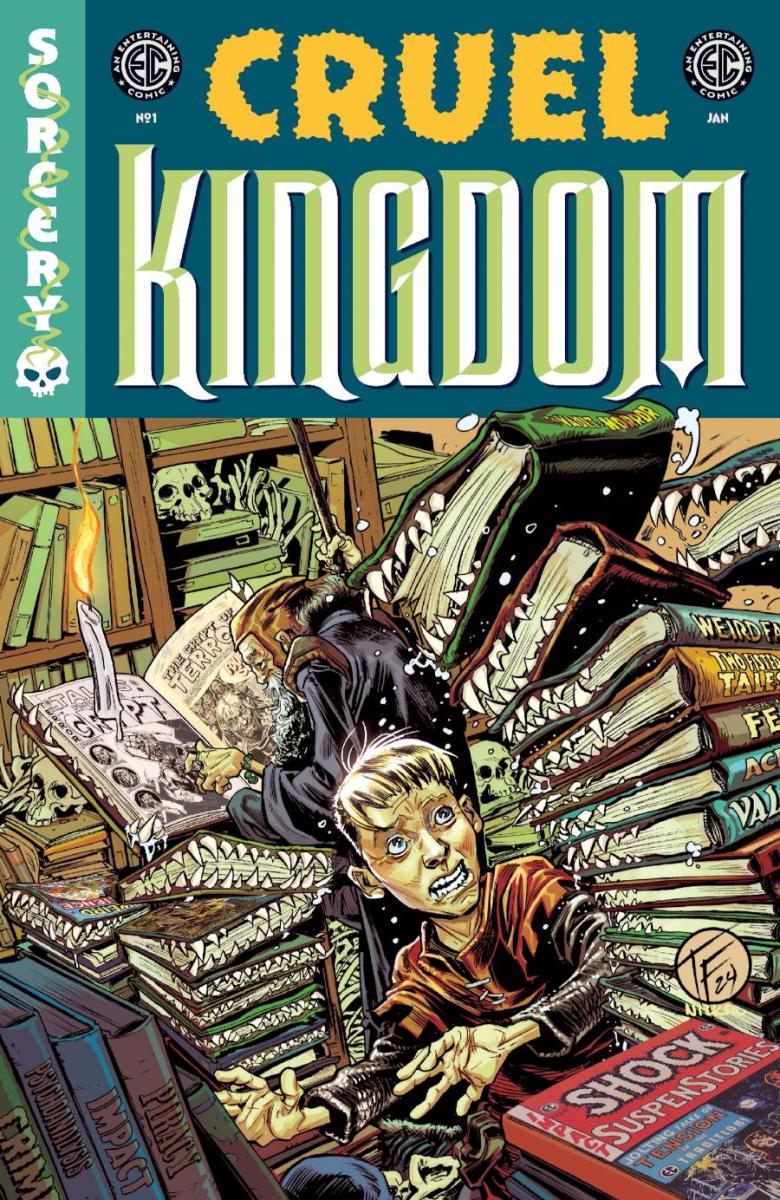 THESE TOMES OF TERROR CERTAINLY HAVE AN APPETITE! Oni Press – the multiple Eisner and Harvey Award-winning publisher of groundbreaking comics and graphic novels since 1997 – is proud to reveal the stunningly secretive 1:100 “Library Variant” cover for January’s CRUEL KINGDOM #1, featuring the voraciously violent titles of EC past come to life from master artist Tom Fowler (MAD Magazine, Refrigerator Full of Heads)