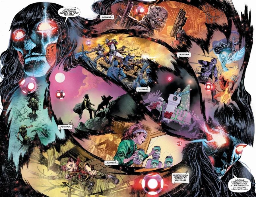 Ghost Machine’s superstar creators—Jason Fabok, Gary Frank, Bryan Hitch, Ivan Reis, and Peter Snejbjerg—join forces with The Rocketfellers‘ Francis Manapul for an epic second issue double-page spread spanning the “four known realities” of this groundbreaking creator-owned collective. The spread will appear in the upcoming The Rocketfellers #2, which will be published by Image Comics and hit shelves next month.