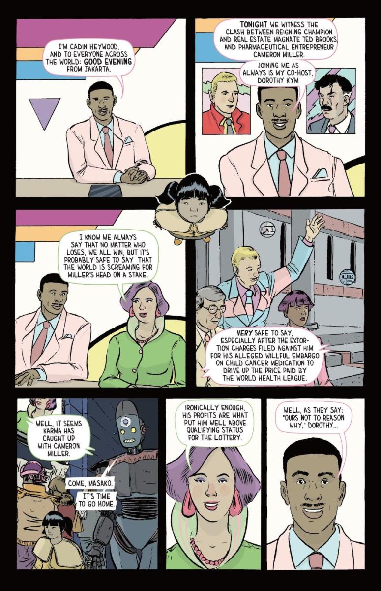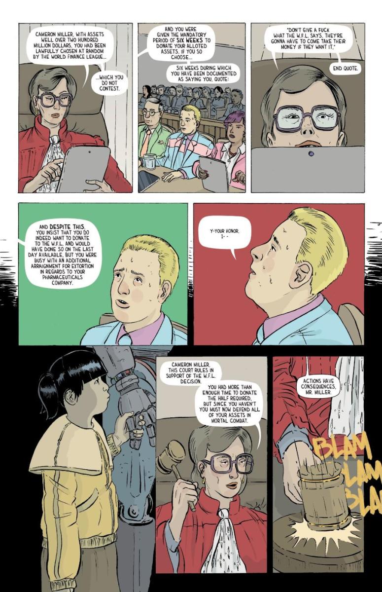 In the future, the World Finance League exists to benefit all, randomly choosing those from among the billionaires and trillionaires of the world and presenting them with a choice: either donate half of their assets to the common good — or defend them in ritual combat.