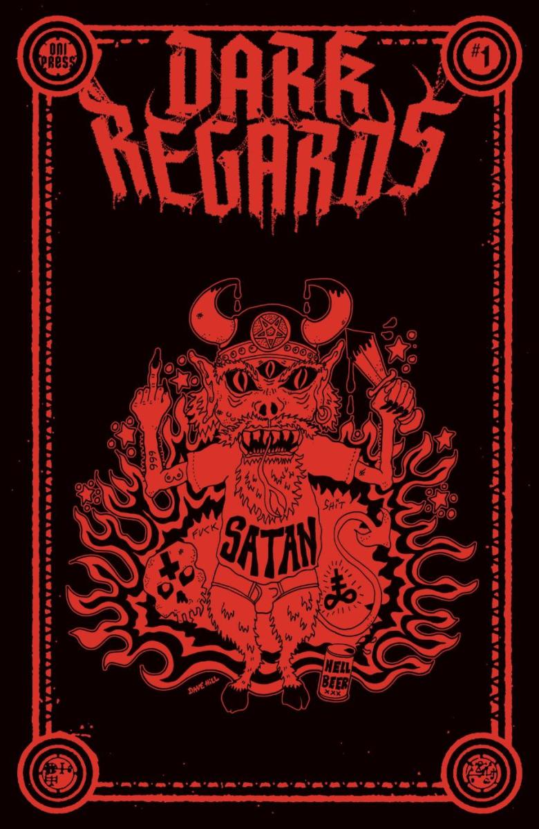 “As every die-hard comics fan and retailer knows, the four members of KISS notoriously mixed their blood into the ink of their Marvel Treasury Edition in 1977,” said Oni Press Publisher Hunter Gorinson. “Ever since I first read about that in a letter column in Wizard Magazine in 1993, I have been looking for a copy … and waiting, patiently biding my time, until Oni Press would be presented with a series so extreme, so hilarious, so incalculably hardcore as to warrant the same treatment. Now, Dave Hill and Artyom Topilin are on the cusp of fulfilling that prophecy with DARK REGARDS #1 – and, through the dark power of multiple Non-Disclosure Agreements, we have figured out how to do the near-impossible: put real-life human blood into a comic book cover.”