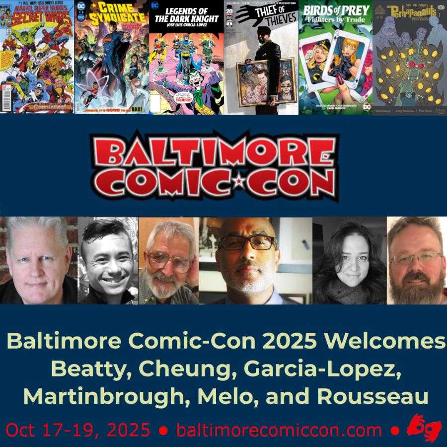 Baltimore Comic-Con returns October 17-19, 2025 at the Inner Harbor’s Baltimore Convention Center. The Baltimore Comic-Con is pleased to announce comics guests John Beatty, Jim Cheung, Jose Luis Garcia-Lopez, Shawn Martinbrough, Adriana Melo, and Craig Rousseau appearing at this year’s event!. Get your tickets are now on our website.