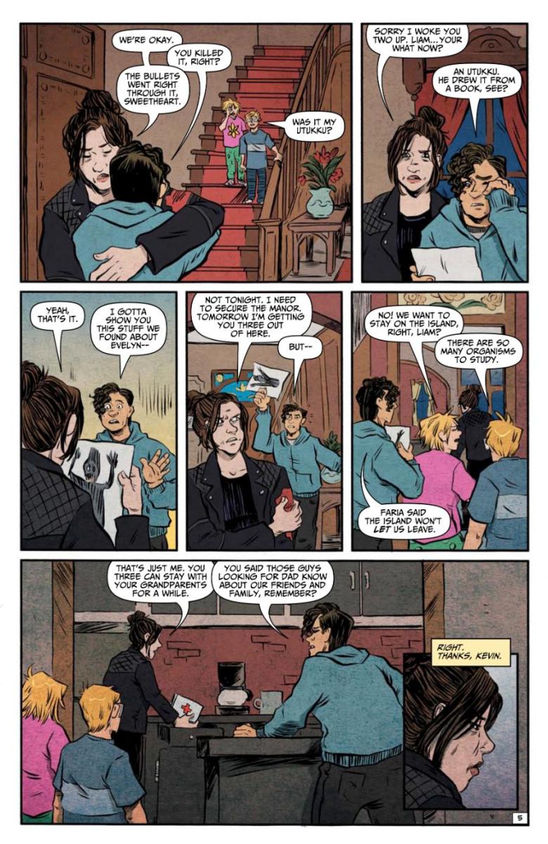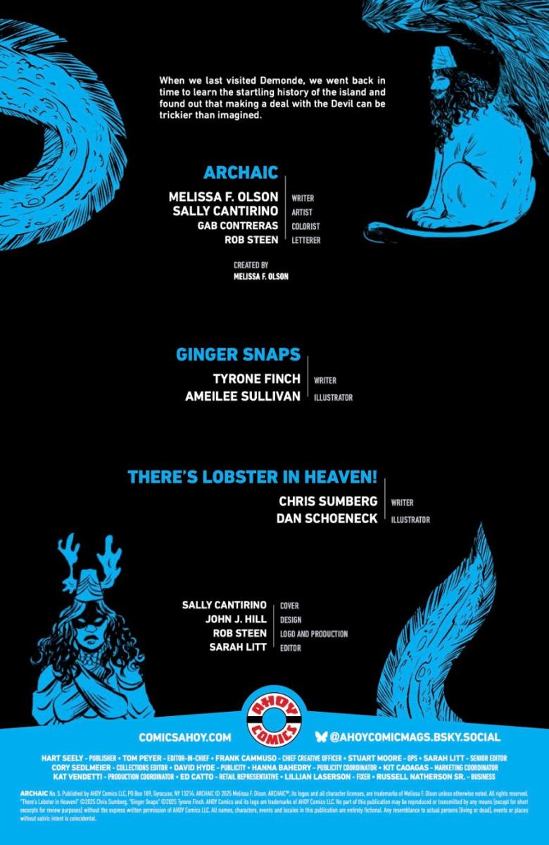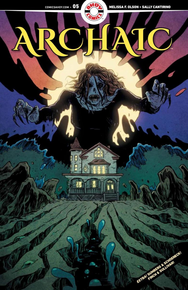 On March 19 AHOY Comics will publish ARCHAIC #5, the fifth and final issue of a modern-day action-adventure which follows the newest residents of a sentient island populated by the gods and monsters of dead civilizations: a harried single mom and her three kids. From writer Melissa F. Olson (Project: Cryptid, Dead Spots), artist Sally Cantirino (I Walk With Monsters), and colorist Gab Contreras (Witchblood), the fast-paced mystery explores what happens to legends once the world no longer has use for them.
