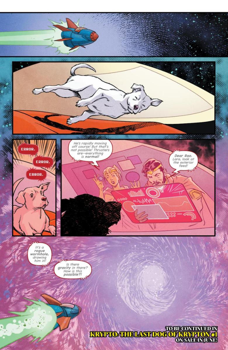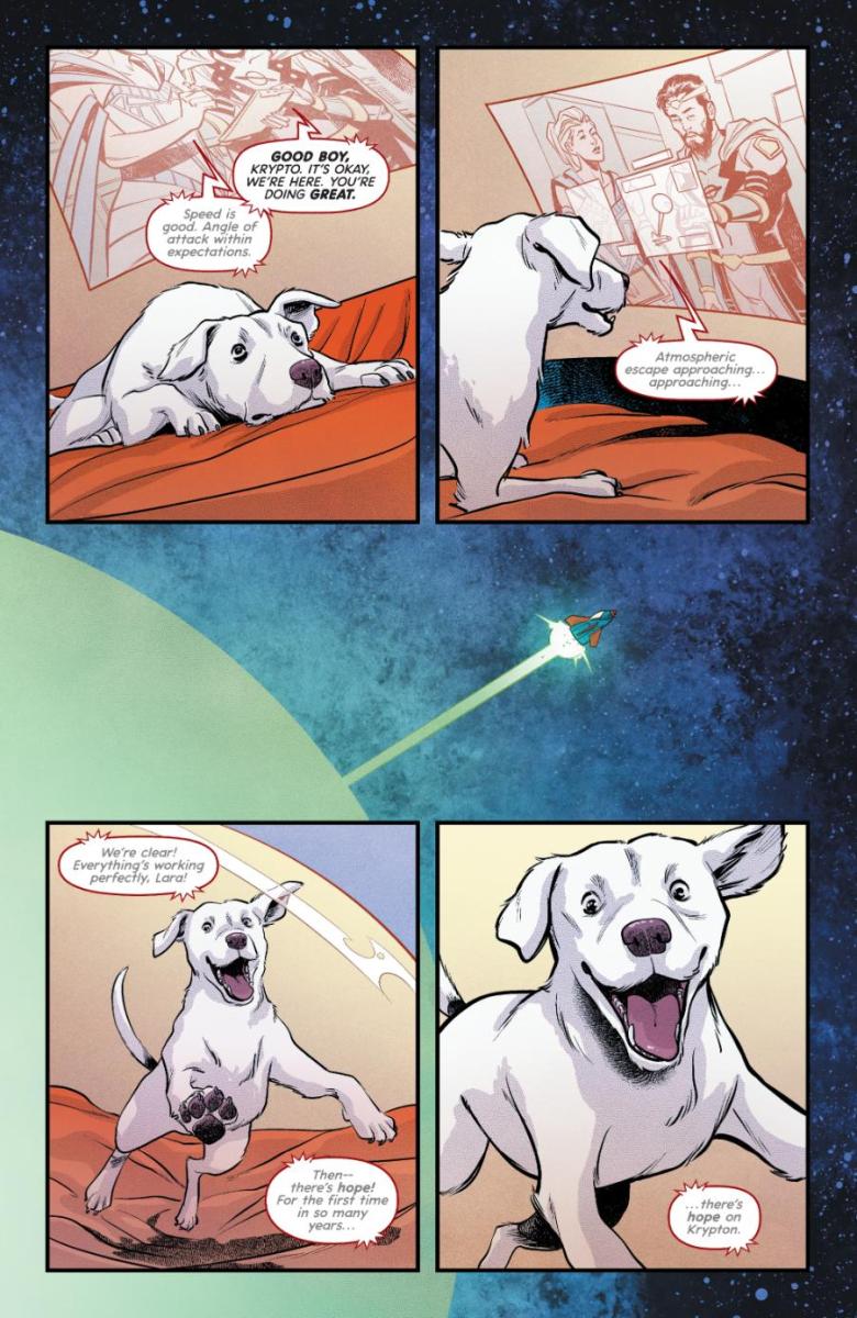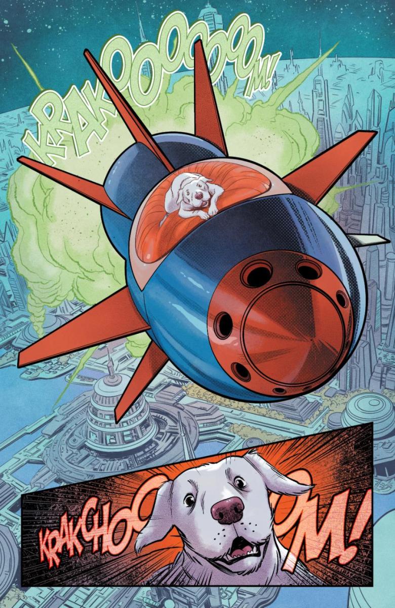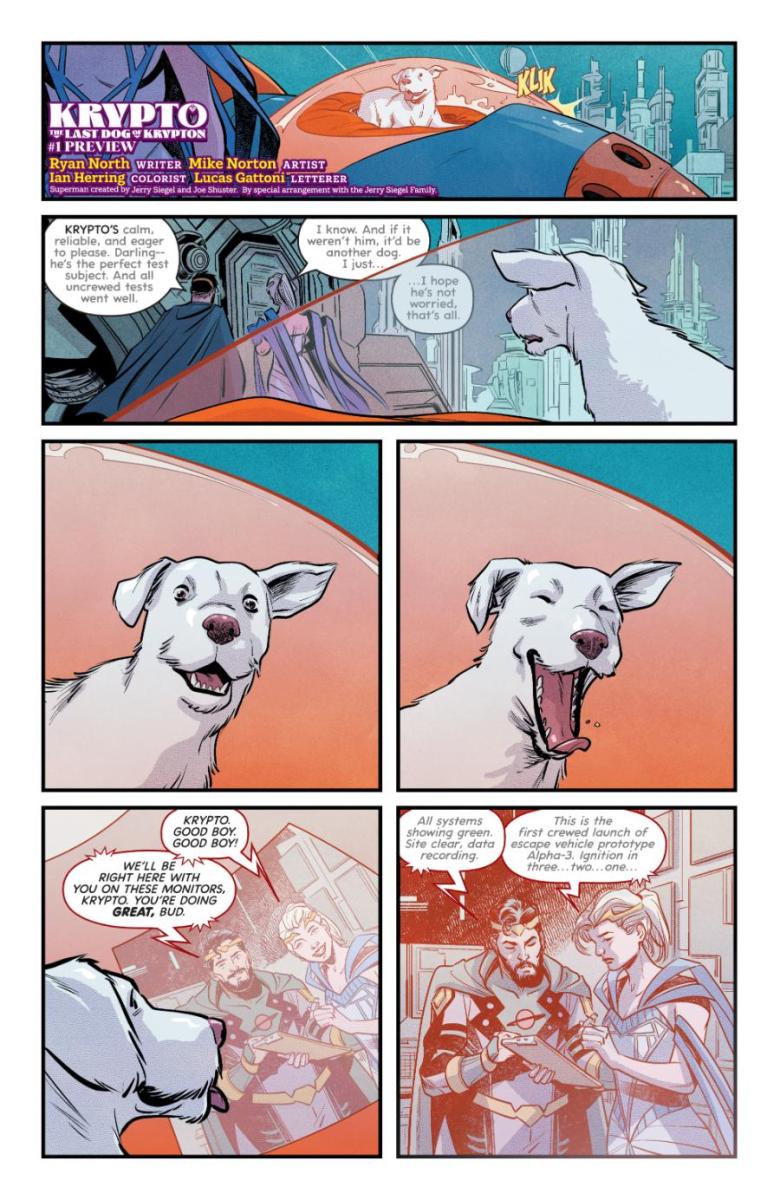 “Krypto’s origin has always been done at kind of a high level,” said Krypto: The Last Dog of Krypton Ryan North. “The little guy starts out on Krypton, ends up on Earth, and helps Superman fight crime. The chance to really define Krypto—to show what a little lost dog would go through if he landed all alone on a strange alien world named Earth—was really enticing. And I also fell in love with the idea of treating Krypto as the actual dog he is: he doesn’t talk, and we don’t cheat by reading his thoughts in balloons either. Mike Norton’s art captures exactly what needs to be ‘said’ in every scene.”