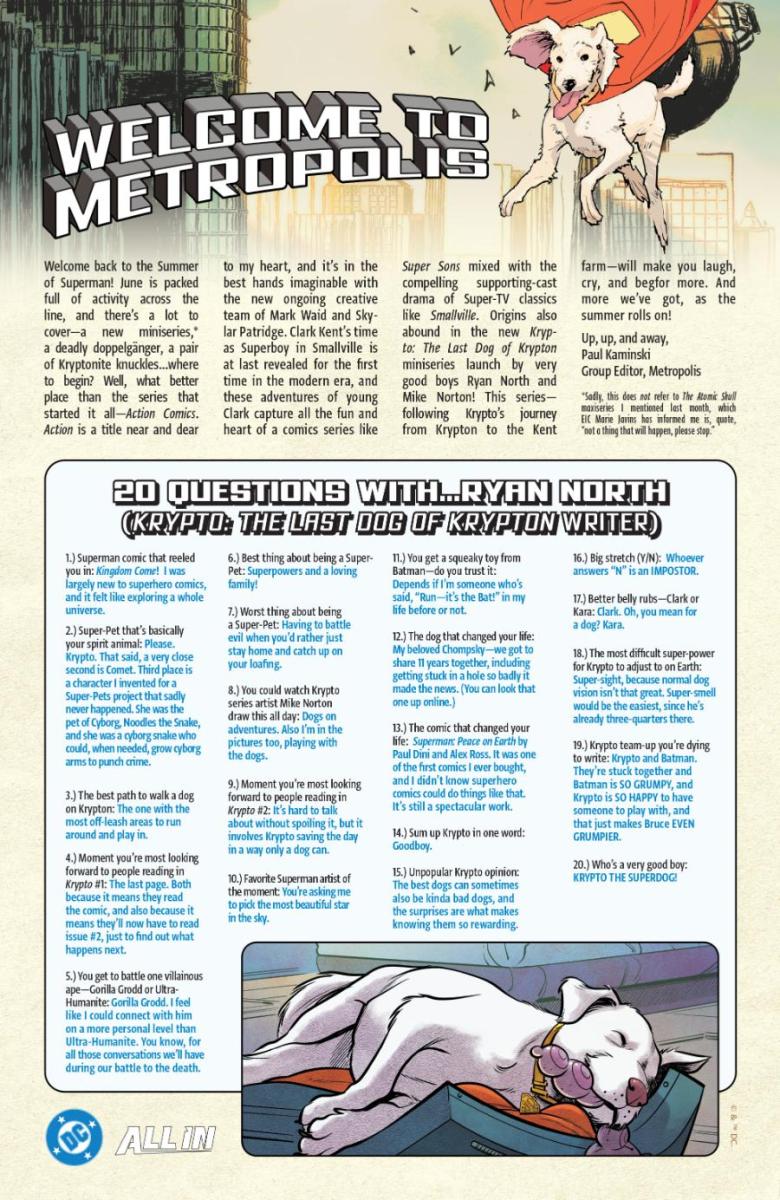 It’s Krypto’s definitive origin story—and a pivotal part of the Summer of Superman—as told by writer Ryan North (Fantastic Four) and artist Mike Norton (Shazam!)! Krypto: The Last Dog of Krypton is set to debut on June 18, and delivers a heartfelt and moving view of humanity, good and bad, through the empathic eyes of the ultimate outsider: a poor, lost dog, who just happens to have superpowers. Krypto: The Last Dog of Krypton #1 will have a main cover by Jae Lee, a variant cover by Dustin Nguyen, a Superman Movie variant cover by Dan Mora, and a blank sketch variant.