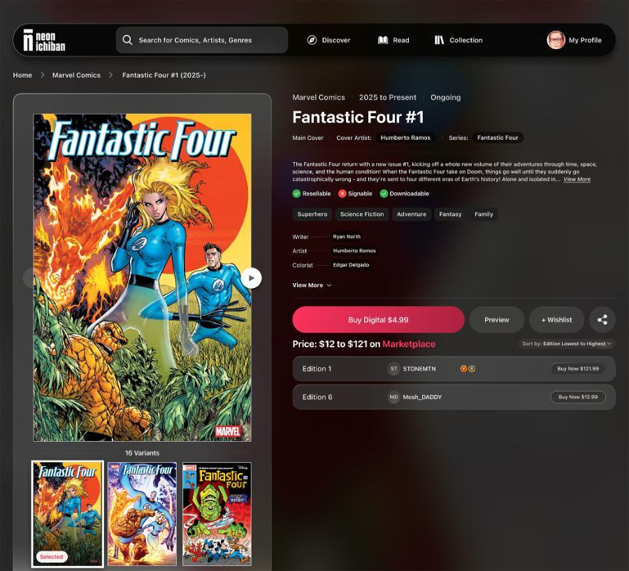 - Secondary Marketplace: Fans can buy and sell owned digital comics and collectibles from participating publishers, adding tangible value to digital purchases. Resales benefit publishers and creators.