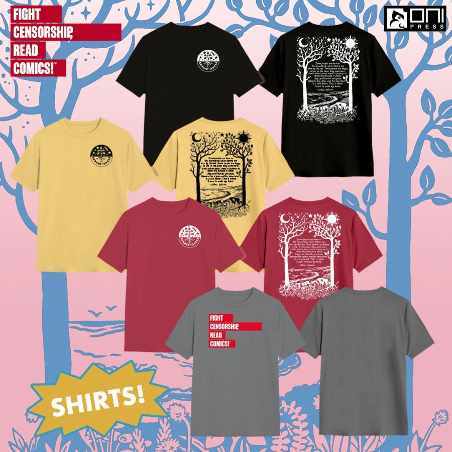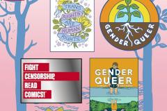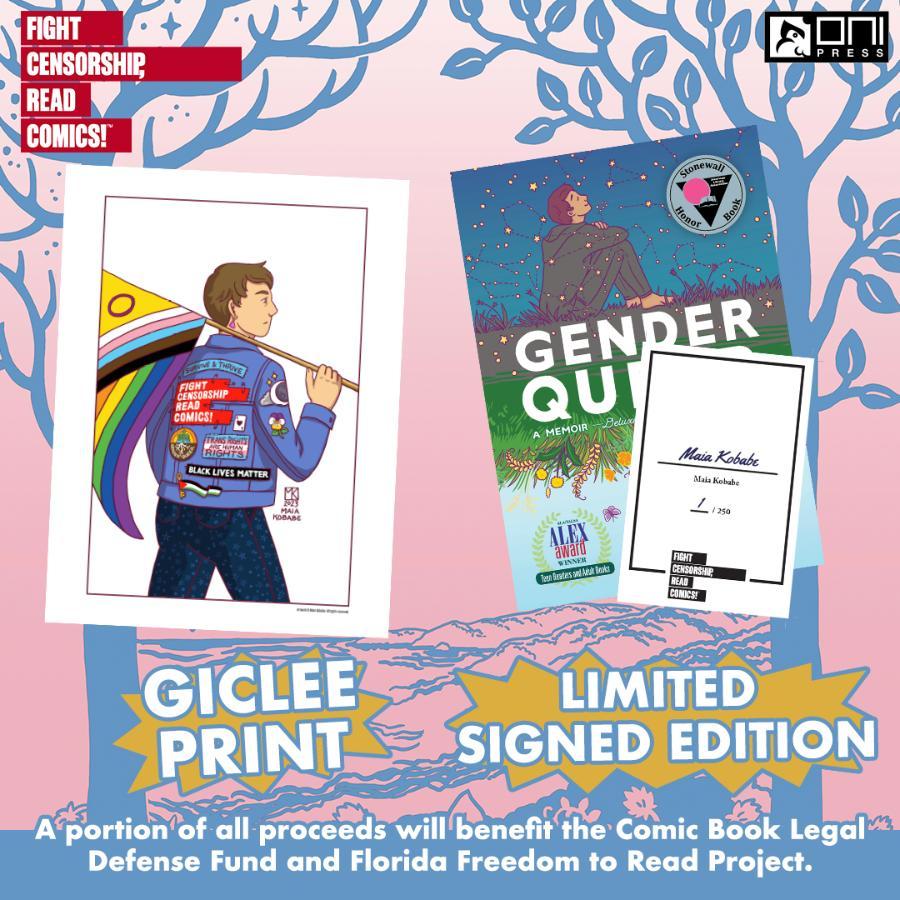 With a portion of all proceeds benefiting the Comic Book Legal Defense Fund (CBLDF) and the Florida Freedom to Read Project (FFTRP), Oni’s new collection of more than 15 items features multiple all-new, never-before-seen pieces, including a brand-new GENDER QUEER t-shirt design by Kobabe, available in three distinct colorways curated by the artist (available in sizes in XS – XXXL) – each hand silkscreened in the United States on super-soft Comfort Colors shirts. The FIGHT CENSORSHIP, READ COMICS Pre-Order Exclusive Merch Collection also features GENDER QUEER patches, enamel pins, and keychains, alongside limited-edition signed and numbered editions of the GENDER QUEER: DELUXE EDITION hardcover bearing signatures by Kobabe and high-quality, 18×24” giclee prints featuring the artist’s powerful “Fight Censorship, Read Comics” artwork (available in both signed and unsigned editions).