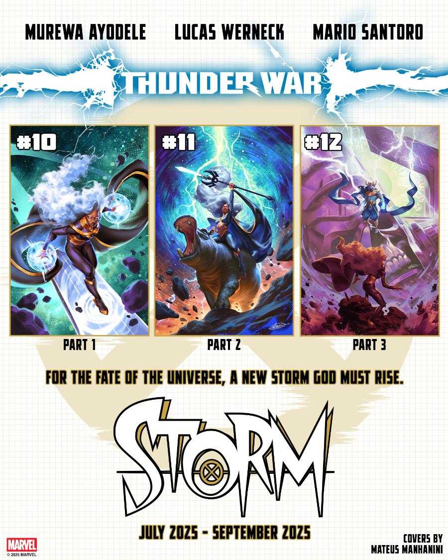 Since launching STORM’s new ongoing series last year, writer Murewa Ayodele and artist Lucas Werneck have proved without a doubt that Ororo Munroe is Earth’s Mightiest Mutant! Now, witness her greatest challenge yet in THUNDER WAR, a three-part arc kicking off this July in STORM #10 and continuing in STORM #11-12, where Ayodele and Werneck will be joined by rising star artist Mario Santoro.