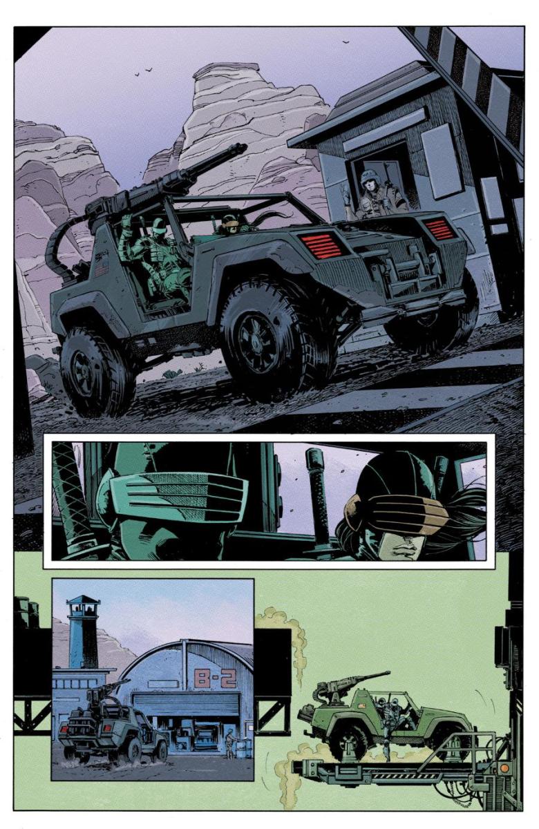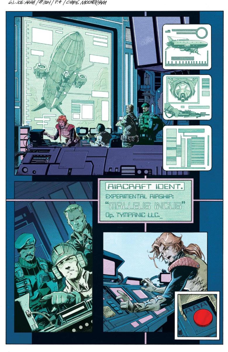 “This is another all-silent issue featuring the return of the sound-weaponizing characters introduced in GI JOE ORIGINS #19,” said Larry Hama. “They have developed an air-portable version of their sonic weapon and have mounted it in a stealth dirigible to attack the GI Joe installation under Camp Greer in the Utah desert. Snake-Eyes and Dawn Moreno having been at the sound-proof range in the lowest level of the Pit, are the only Joes unaffected, and must attack the airship by themselves.”