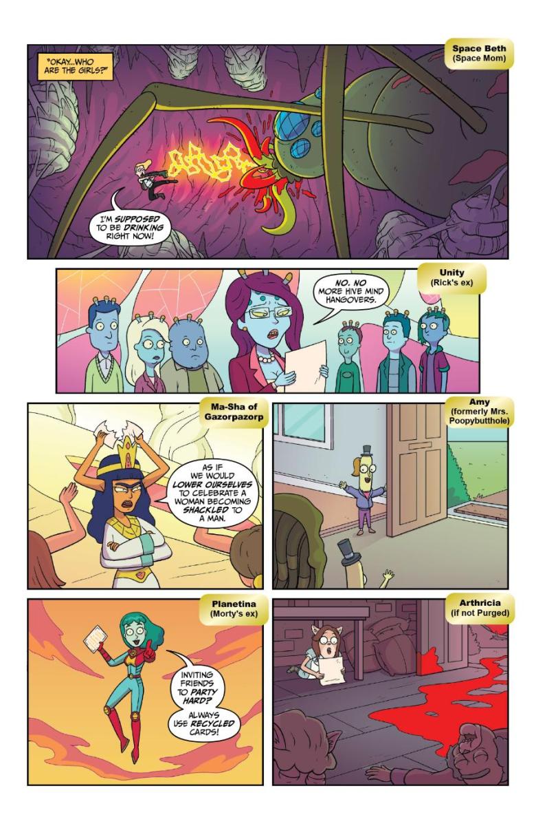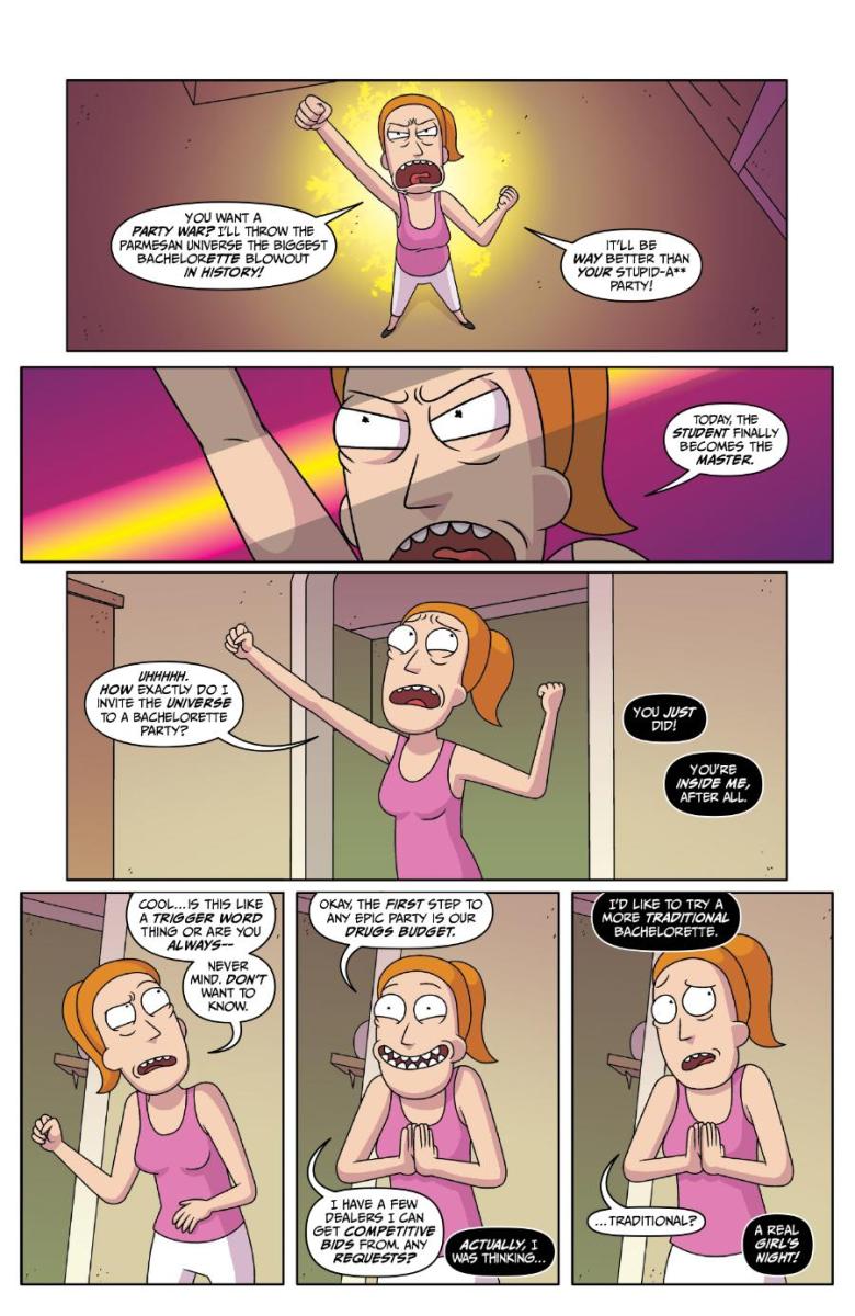 WELCOME TO THE FIRST RICK AND MORTY VS. THE UNIVERSE TIE-IN EXTRAVAGANZA! Summer rockets into a Smith family crisis with cosmic implications! Rick and Morty are doing their bachelor party thing with Prime Universe, so Summer decides to throw her own bachelorette shindig for Parmesan! No naughty gummies or pennysaver strippers here—Summer will throw a bachelorette party to remember, complete with debauchery, violence, and destruction! Hey, this will end well! (News flash: It won’t.)