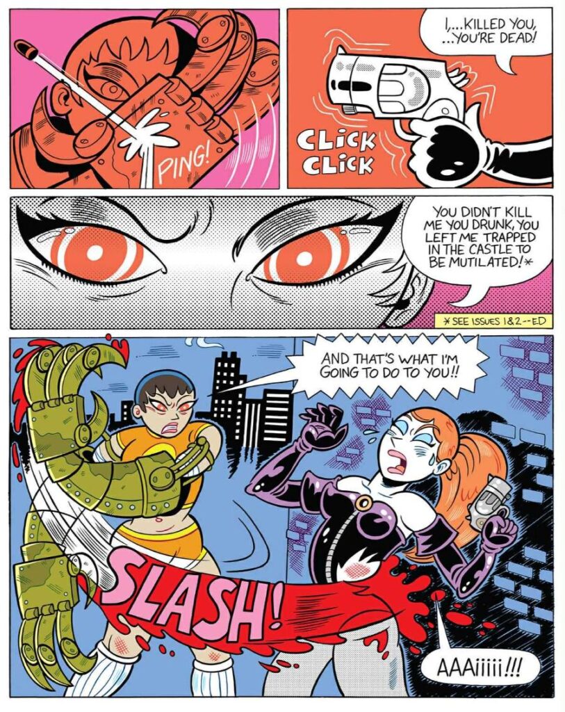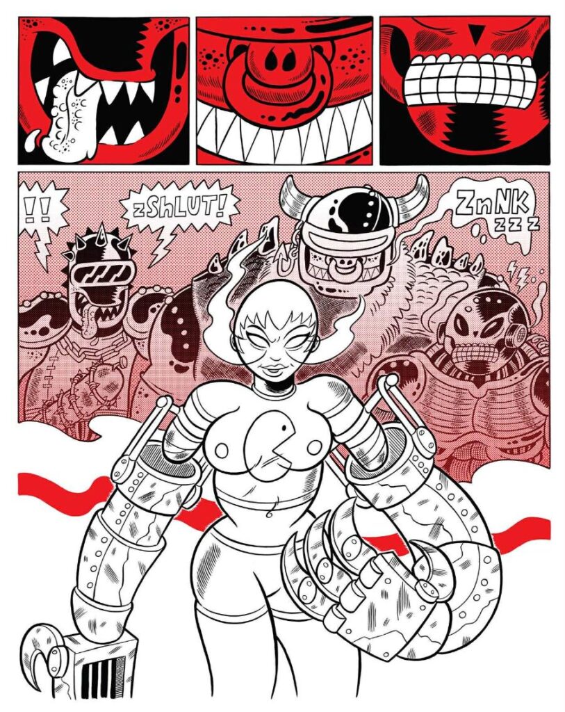 SGR: I’ve always been more inspired by animation than comics, at least initially. Stuff like Fleischer Brothers, Tex Avery, and Spümcø cartoons. Later on, that inspiration got blended with Peter Chung’s Aeon Flux and anime like Akira and Ghost in the Shell. Comics-wise, I was influenced earliest by Mad Magazine and Archie Comics, then later on stuff like Sam Keith’s Maxx and David Mack’s Kabuki, until I discovered alternative indie comics like Dan Clowes’ Eightball, Dave Cooper’s Weasel, and Chris Ware’s Acme Novelty Library. Junko Mizuno remains a massive influence on me. FutureLux was specifically influenced by Mizuno’s works, along with children’s fairy tales such as Alice in Wonderland, The Wizard of Oz, and Winnie the Pooh.