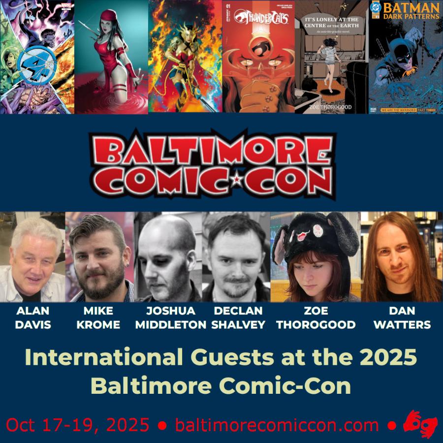 This year’s Baltimore Comic-Con takes place at the Inner Harbor’s Baltimore Convention Center on October 17-19, 2025. The Baltimore Comic-Con announces the appearance of international comics creators Alan Davis, Mike Krome, Joshua Middleton, Declan Shalvey, Zoe Thorogood, and Dan Watters. Tickets to the show can now be purchased online.