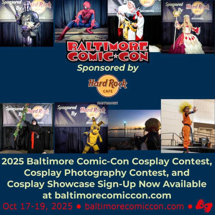 The Baltimore Comic-Con and the Hard Rock Cafe Baltimore have once again joined forces to proudly present the 2025 Cosplay Contest! We are thrilled to welcome back Hard Rock Cafe Baltimore as our 2025 Cosplay events sponsor, bringing back the internationally-recognized pop cultural brand and destination as the partner for one of the convention’s premier events. The Baltimore Comic-Con will be held the weekend of October 17-19, 2025 at the Baltimore Convention Center. Tickets for admission to the event are available now!
