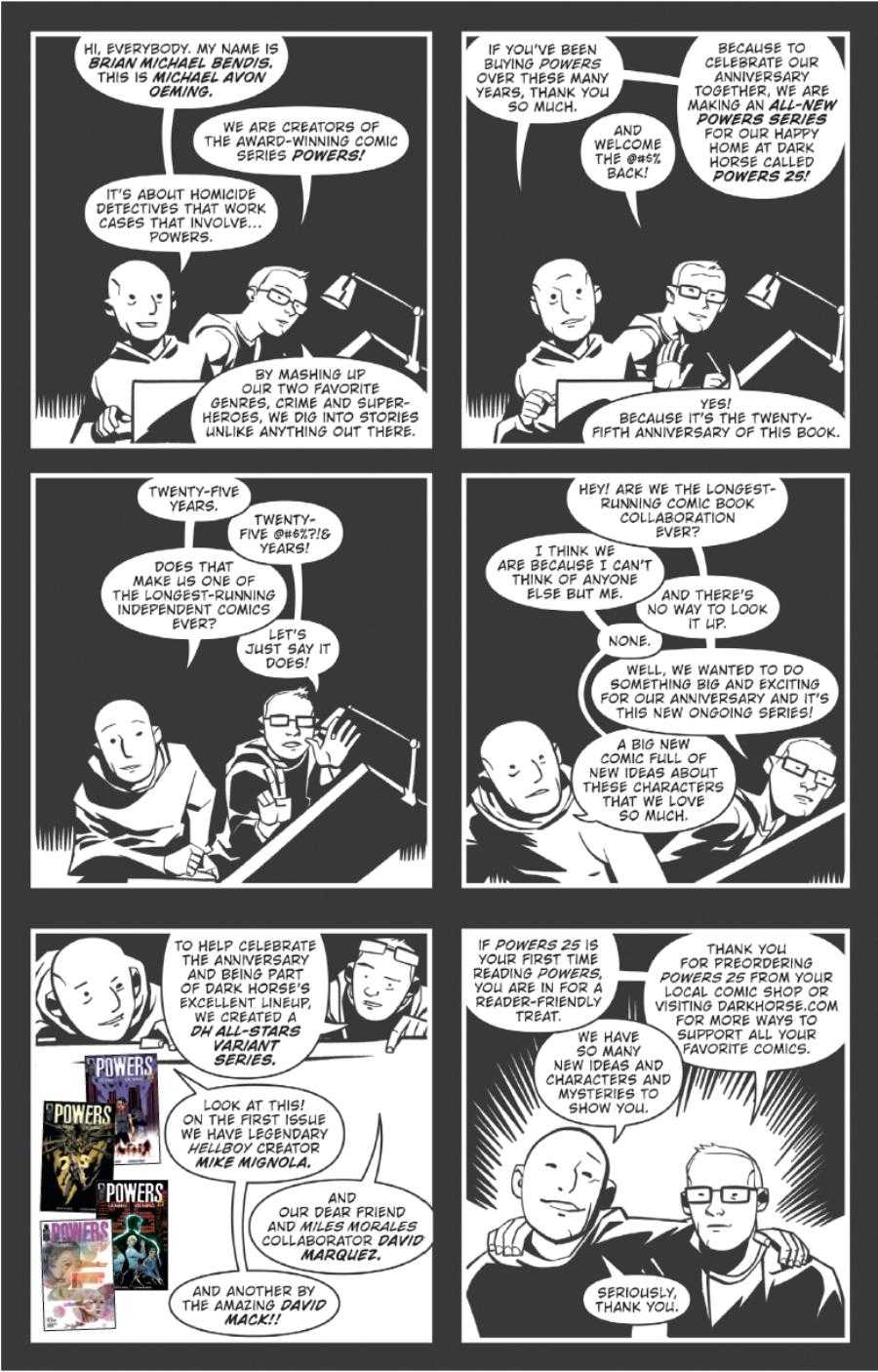 Every month, Dark Horse Comics gives readers a behind-the-scenes look at the making of a comic or book. These articles can include the inspiration behind a specific title, what it’s like to work in the comics industry, or some other special feature on the highlighted title of the month. In this month’s Horsepower, Brian Michael Bendis and Michael Avon Oeming Celebrate 25 years of their cops and capes epic, Powers!