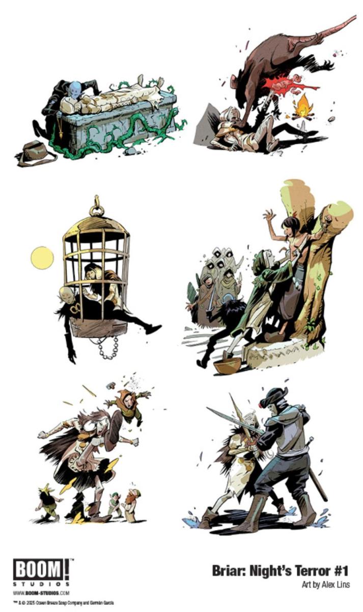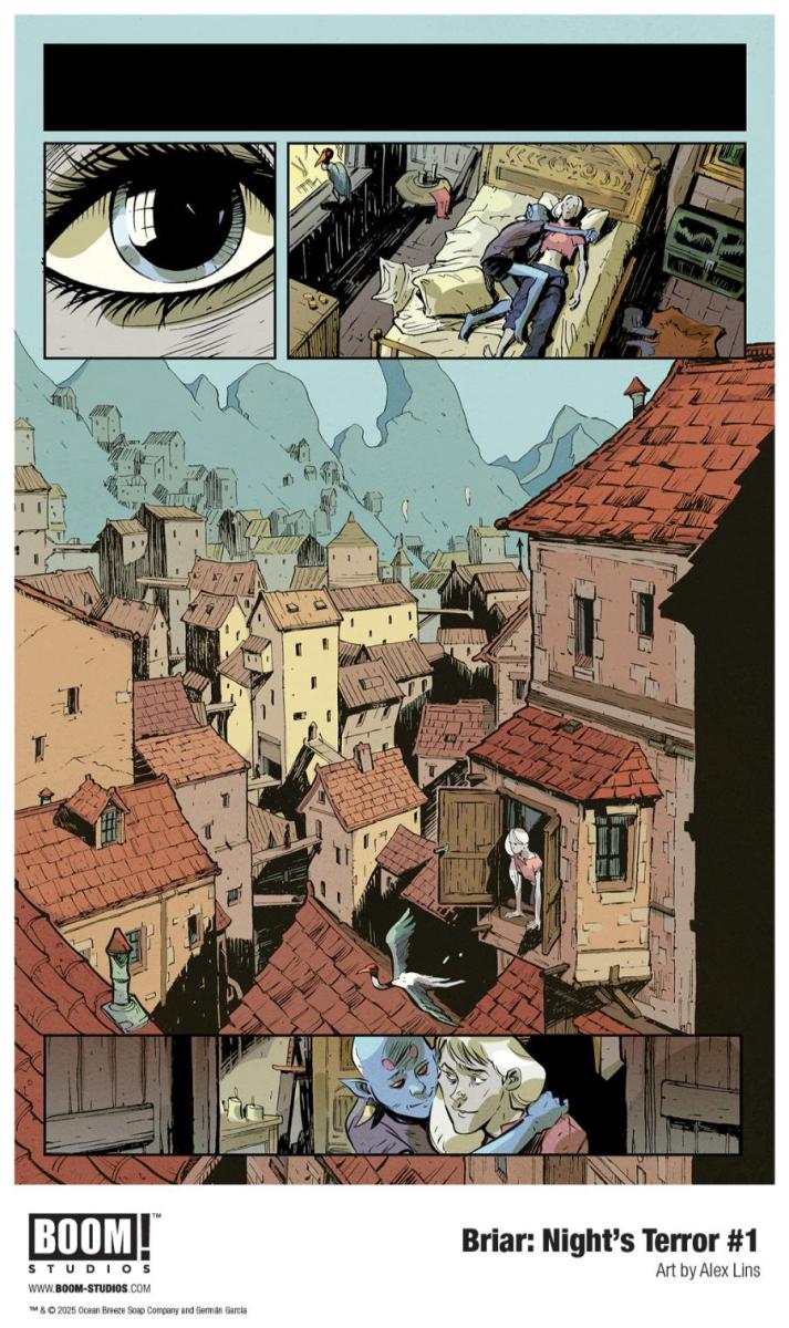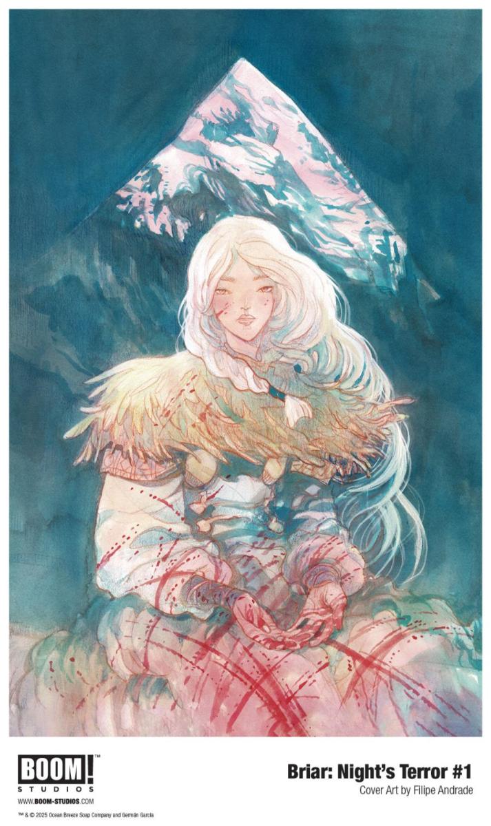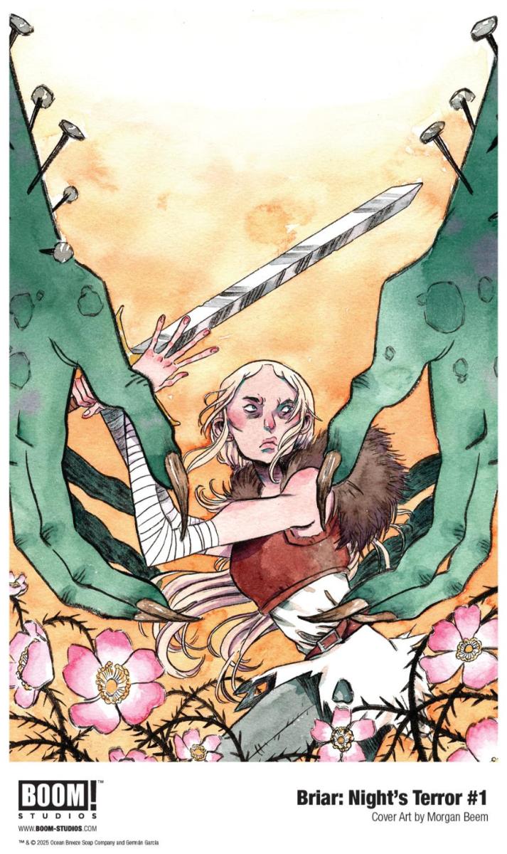 BRIAR: NIGHT’S TERROR #1 is the newest release from BOOM! Studios’ eponymous imprint, home to critically acclaimed original series, including BRZRKR by Keanu Reeves, Matt Kindt, and Ron Garney; Something is Killing the Children by James Tynion IV and Werther Dell’Edera; bestselling horror anthology Hello Darkness; Grim by Stephanie Phillips and Flaviano; Stuff of Nightmares by R.L. Stine and A.L. Kaplan; A Vicious Circle by Mattson Tomlin and Lee Bermejo; Ghostlore by Cullen Bunn and Leomacs; Rare Flavours by Ram V and Filipe Andrade; Underheist by David and Maria Lapham; Animal Pound by Tom King and Peter Gross; Minor Arcana byJeff Lemire; Vicarious by Ryan Parrott and Eleonora Carlini; The Creeping Below by Brian Azzarello and Vanesa Del Rey; Bronze Faces by Shobo, Shof, and Alexandre Tefenkgi; In Bloom by Michael W. Conrad and John J. Pearson; and When I Lay My Vengeance Upon Thee by Gus Moreno and Jakub Rebelka. The imprint also publishes popular licensed properties, including Dune: House Corrino from Brian Herbert, Kevin J. Anderson, and Simone Ragazzoni; Power Rangers Prime by Melissa Flores and Michael YG; and The Expanse: A Little by Andy Diggle, Wes Chatham, and Francesco Pisa.