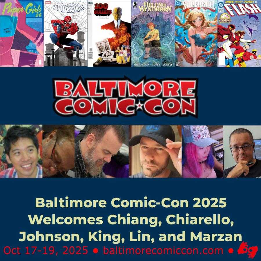 We will see you at the 2025 Baltimore Comic-Con on October 17-19 at the Inner Harbor’s Baltimore Convention Center. The Baltimore Comic-Con is pleased to announce the addition of Cliff Chiang, Mark Chiarello, Dave Johnson, Tom King, Rachta Lin, and Jose Marzan Jr. to our 2025 event. Avoid waiting in additional lines — get your tickets online!