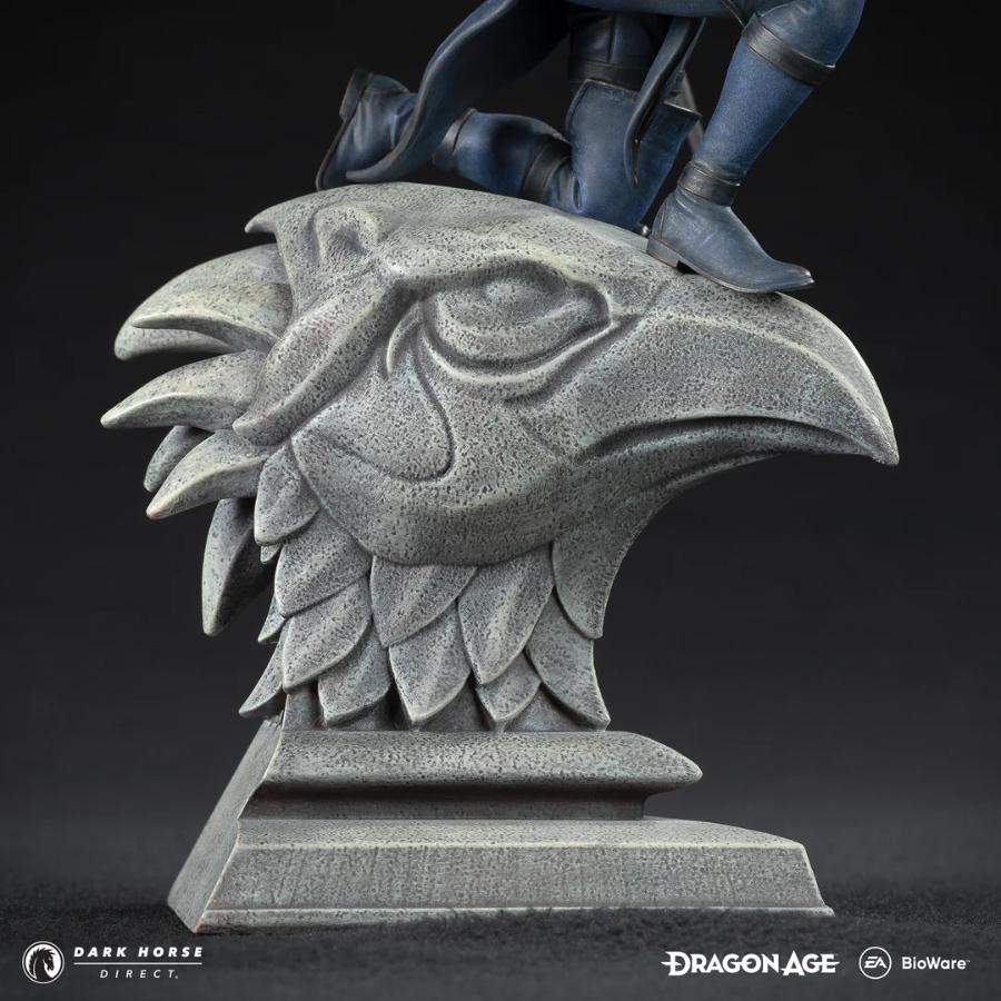 Standing at 9.25” tall atop a 6” deep sculpted eagle headstone, Lucanis has been brought to life in meticulous detail by Bigshot Toyworks and painted by J.W. Productions. Lucanis’ signature Wings of Antiva give this statuette a width of 9.125”.