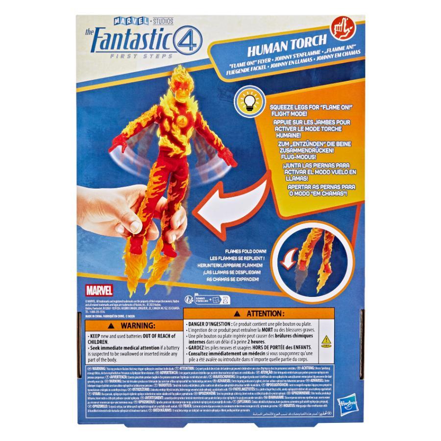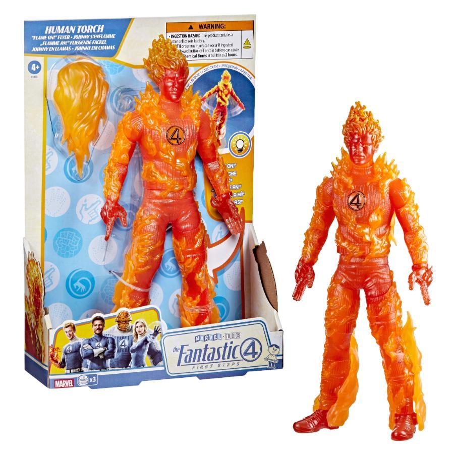 Imagine cosmic adventures with this Marvel Human Torch “Flame-On!” Flyer toy from Hasbro! Playtime gets a blazing boost of action with this collectible action figure, featuring basic articulation for poseable play. Fold down the sculpted flame effects on the figure’s lower legs to mimic the Human Torch’s iconic flame trail, then squeeze the legs together to activate the “Flame-On!” flight mode. Kids ages 4 and up can continue squeezing the legs to cycle through five separate light-up effects. Requires 3x 1.5V A76/LR44 batteries (included).