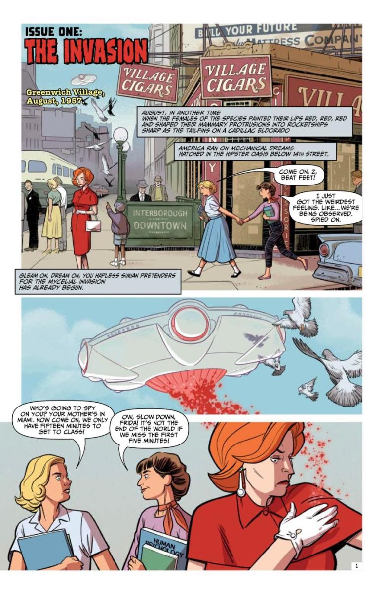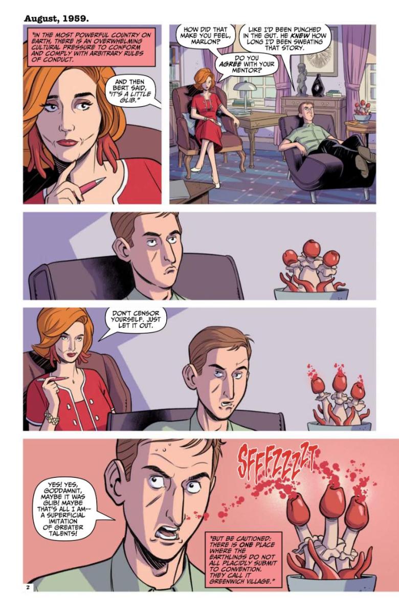 Marry a science fiction writer, become science fiction! That’s the law of Greenwich Village in the late 1950s, home of poets, artists, musicians, writers, their put-upon partners—and the extraterrestrial spores that are secretly taking them over! Novelist/comics writer Alisa Kwitney (The Sandman Presents) mixes science fiction with period drama and family memoir, featuring stunning art by Mauricet (Star Wars Adventures).