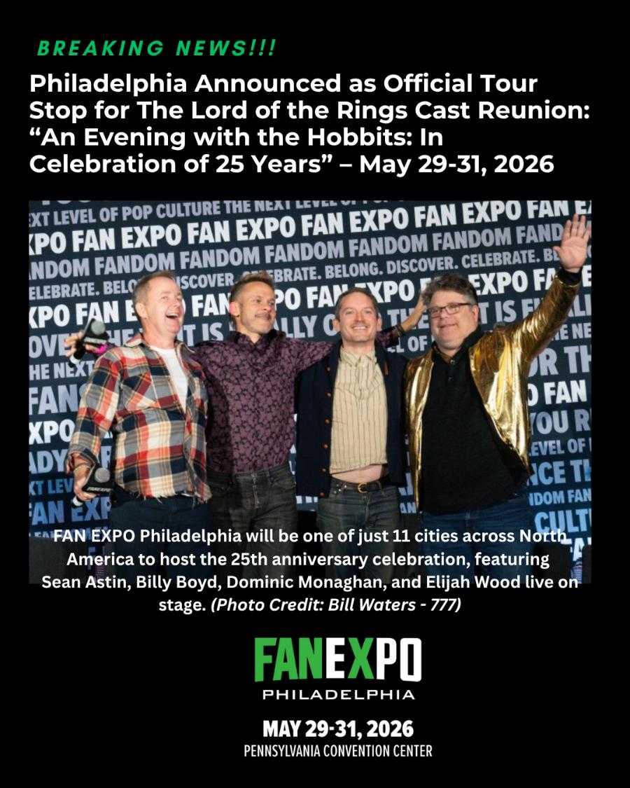 Twenty-five years ago, four grateful Hobbits left the Shire and changed the face of fantasy forever. In 2026, Sean Astin, Billy Boyd, Dominic Monaghan, and Elijah Wood will reunite with fans for An Evening with the Hobbits: In Celebration of 25 Years, a once-in-a-quarter-century celebration tour that will be featured at 11 FAN EXPO HQ shows across North America – including in Philadelphia (May 29-31, 2026) at FAN EXPO Philadelphia.