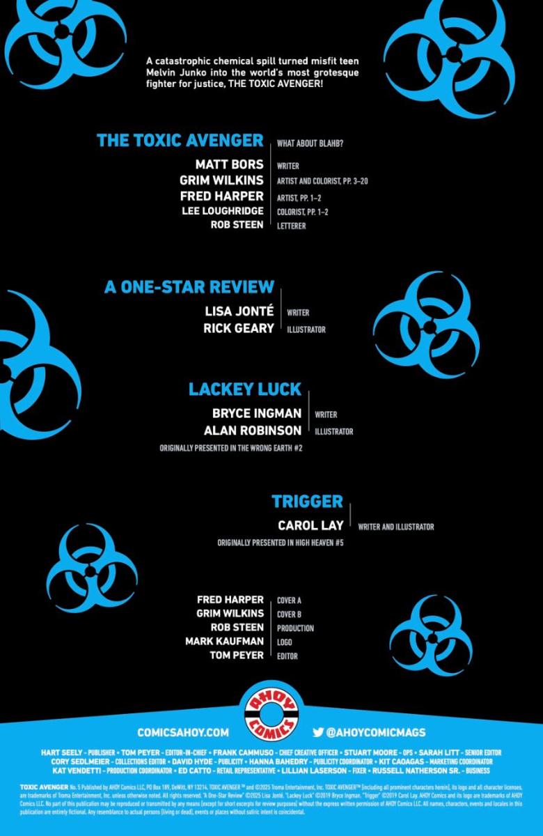 On Wednesday November 26, acclaimed Syracuse-based comic book publisher AHOY Comics will publish THE TOXIC AVENGER COMICS #5, the latest issue in an all-new ongoing series masterminded by THE NIB founder and two-time Pulitzer Prize finalist Matt Bors, who will be writing the series. Each issue of THE TOXIC AVENGER COMICS’ first story arc will be illustrated by a different artist and showcase a different genre, such as horror (#1), crime (#2), sci-fi (#3), and romance (#4). Issue #5 is a fantasy-themed story written by Bors and illustrated by Fred Harper and Grim Wilkins, with covers by Harper and Wilkins. The first 2 pages of each issue in the arc are by Harper — leading up to issue #6, aka “Toxie Goes to Washington.”