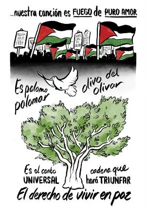 For artists who are “más allá del ancho mar,” beyond the wide sea, in Victor Jara’s words, we draw our love, heartbreak, solidarity, and rage with our fellow artists in Palestine.