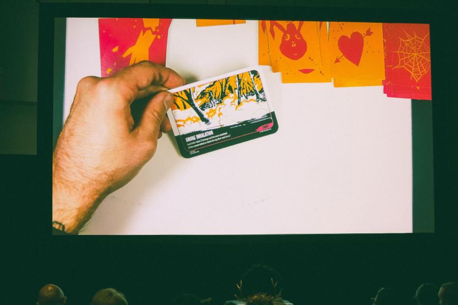 Walsh started designing the game mechanics even ahead of the first story summit in Buffalo, where the Corpse Crew and Tiny Onion team gathered in a writers room to break out the first season. Via dry-erase cards, the Corpse Crew did the first beta test at the summit. To ensure quality gameplay and balance, Walsh has been playtesting the game since early 2024 with a dedicated playtester group, dubbed “The Barn Burners.” The goal was to create a game that is easy to pick up, but hard to put down.