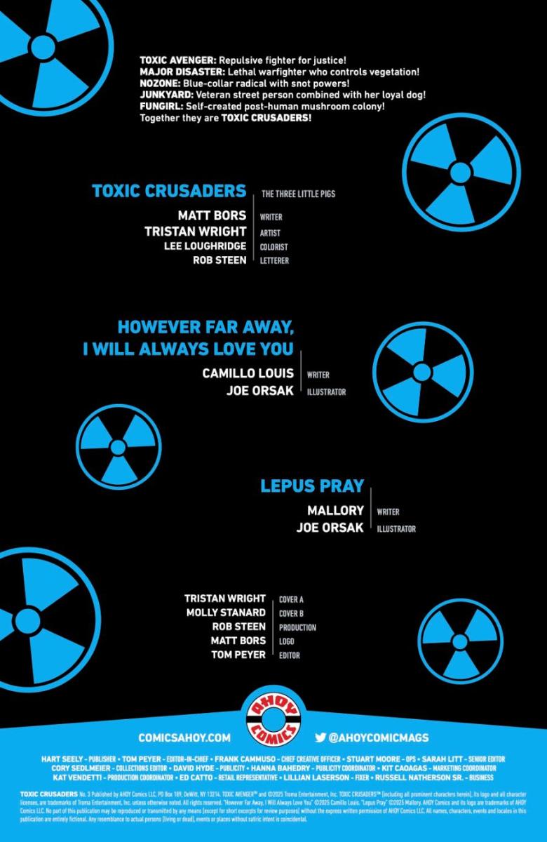 Next Wednesday December 24, join in the rebirth of the greatest and grossest animated-series sensation of all time with TOXIC CRUSADERS #3, the latest issue in an all-new limited comic book series featuring the Toxic Avenger of Troma Entertainment fame alongside fellow mutants No-Zone, Junkyard, Major Disaster, and the all-new character Fungirl. The five-issue series from acclaimed Syracuse-based comic book publisher AHOY Comics is being written by THE NIB founder and two-time Pulitzer Prize finalist Matt Bors — whose recent revival of the Toxic Avenger in comics received widespread acclaim — and features art by debut talent Tristan Wright.