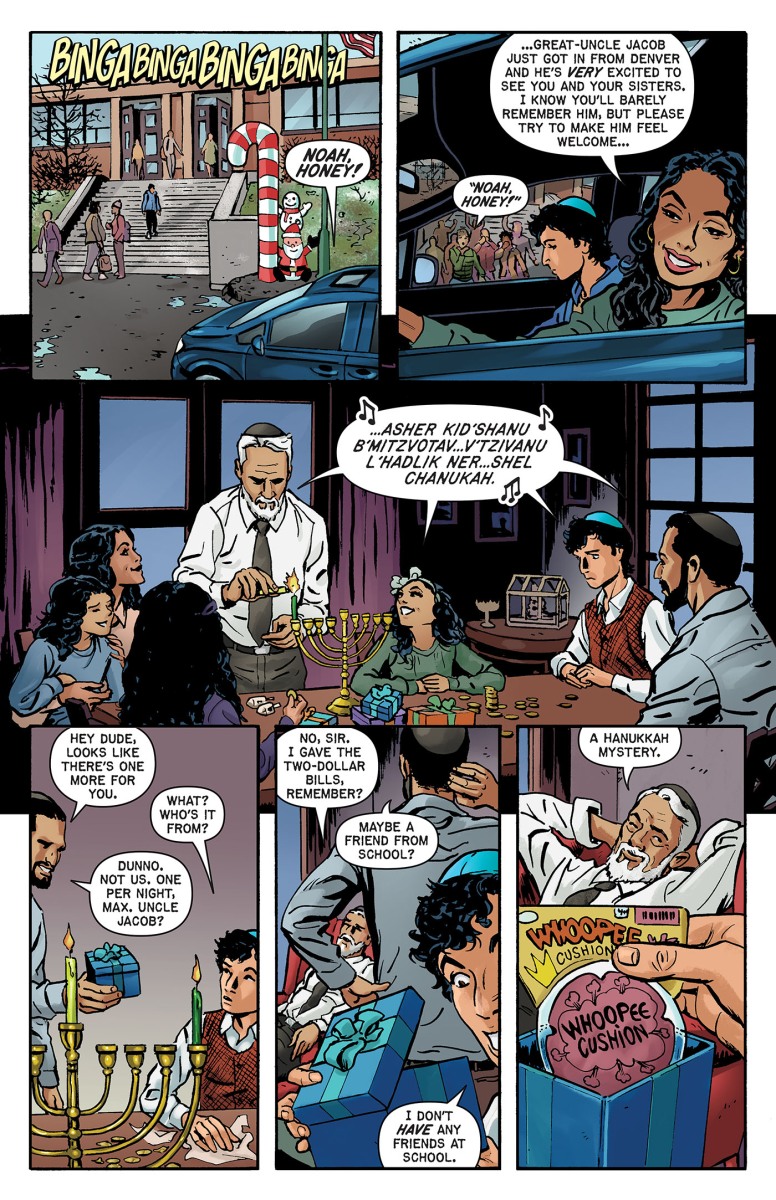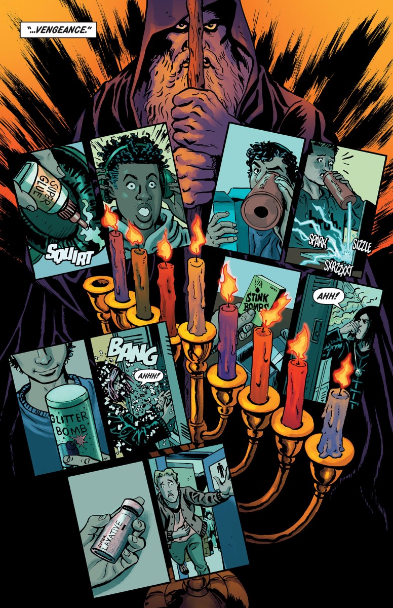 “I’m delighted to once again be a part of Oni’s twisted look at the holiday season, and especially proud to be representing the traditions of my own personal forefathers, taking a classic tale of revenge and putting a dreidel-style spin on it,” said writer Ben H. Winters. “Young Noah is sick and tired of being the butt of his classmates’ taunting and cruelty, but never did he imagine that the joyful festival of Hanukkah would present him the opportunity to take his eight-fold revenge. Maybe let’s not show this one to my mother, or my rabbi…although in the end I think ‘Eight Vengeful Nights’ delivers a message in the spirit of the season.”