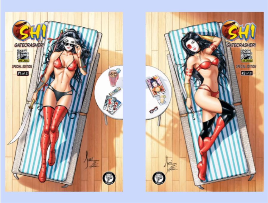 2 • SDCC: The Cruise Shi: Gatecrasher Part 1 Pure Line Edition: Featuring a sultry bikini inspired Shi sunning herself casually and coyly atop the Lido Deck. Limited to just 25. 28-pages, F/C covers and B/W interiors. $30 USD