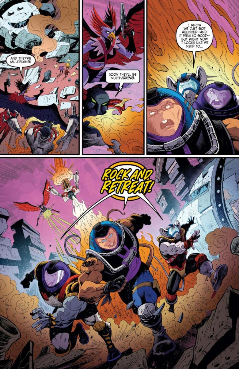On sale in comic shops everywhere tomorrow, the final issue (for now!) of the Biker Mice’s high-octane ongoing series reveals the coming of outrageous anti-hero called Scorch – courtesy of out-of-this-world Matt Hotson (Power Rangers: The Return) and Jordi Tarragona (Hal Jordan and the Green Lantern Corps) – as Throttle, Modo, and Vinnie rocket into their strangest mission yet! The Biker Mice have blasted into the most bizarre corner of the galaxy—the villainous Lectromag’s sprawling deep-space stronghold known only as the Merge! Still reeling from the loss of their best bro, Throttle and Modo must push past their grief . . . but the Plutarkians aren’t giving them time to breathe. With a galaxy-wide bounty on their heads, every mercenary from here to the Large Magellanic Cloud is out for their tails!