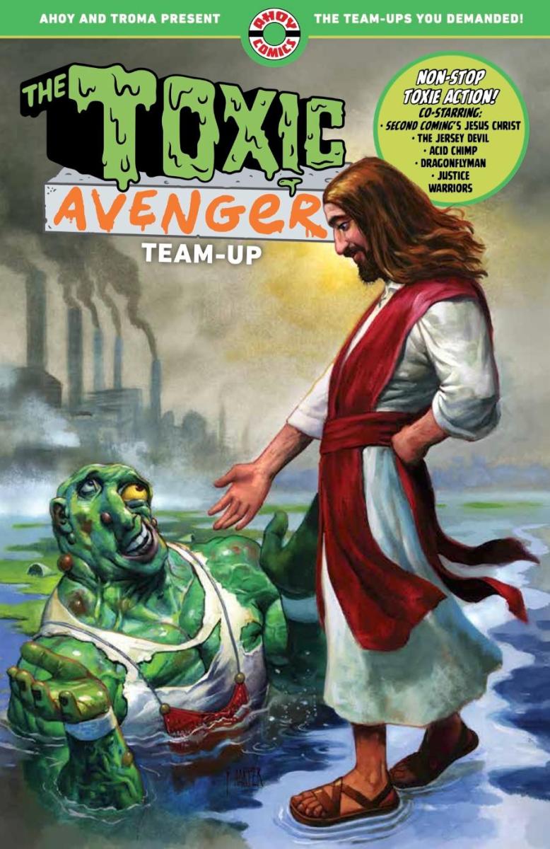 Next Wednesday January 28, acclaimed Syracuse-based comic book publisher AHOY Comics will publish TOXIE TEAM-UP, the trade paperback collection of the latest comic book adventure for the legendary Toxic Avenger from the Troma Films cult classic films. Following Matt Bors and Fred Harper’s acclaimed revival of the character in 2024, the ambitious mini-series found Toxie rubbing elbows with characters from a number of other fan-favorite AHOY titles: Jesus Christ (from Mark Russell and Richard Pace’s controversial SECOND COMING), the Jersey Devil (from the creature-packed anthology PROJECT: CRYPTID), Acid Chimp (from Russell, Bryce Ingman and Peter Krause’s absurdly hilarious MY BAD), Dragonflyman and Stinger (from Tom Peyer and Jamal Igle’s multiversal saga THE WRONG EARTH), and Swamp Cop and Schitt (the crooked mutant copsfrom Bors’ and Ben Clarkson’s sensational satire JUSTICE WARRIORS).