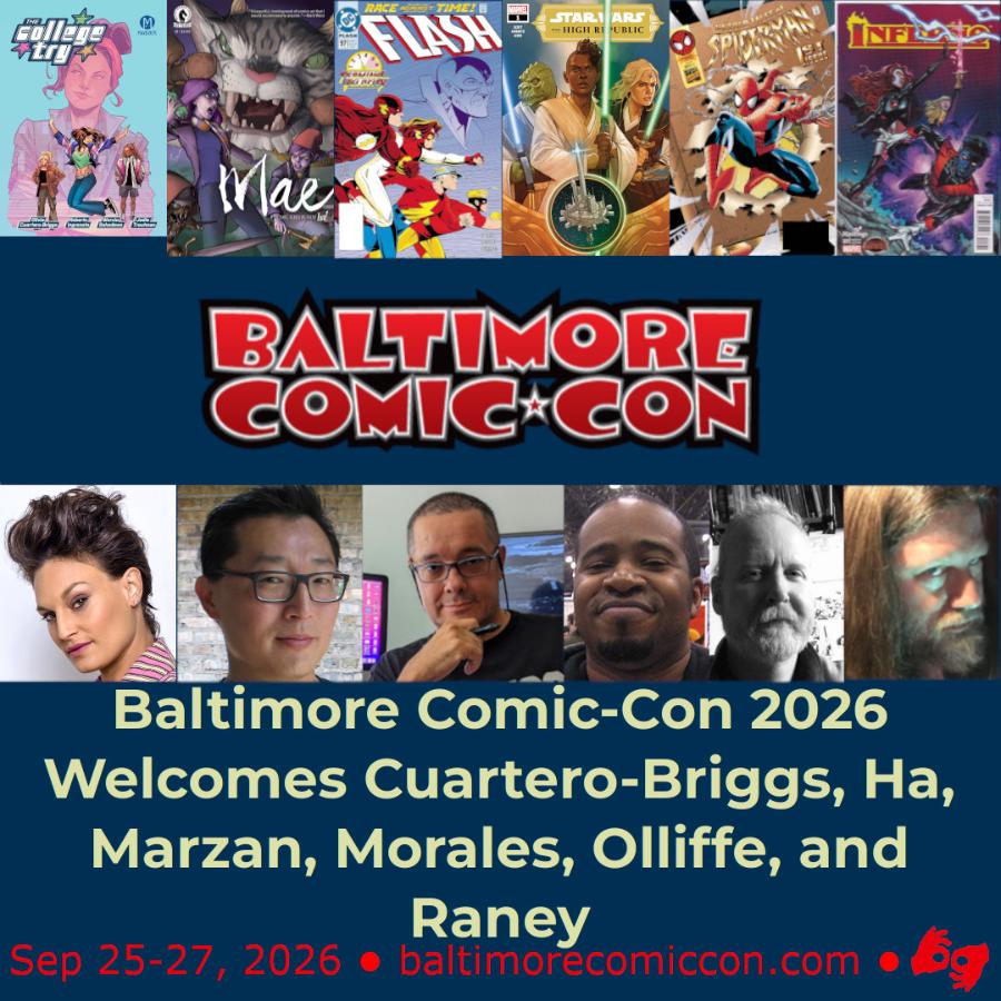 Come to the 2026 Baltimore Comic-Con at the Inner Harbor’s Baltimore Convention Center on September 25-27, 2026. The Baltimore Comic-Con is pleased to announce Baltimore Comic-Con 2026 Welcomes Olivia Cuartero-Briggs, Gene Ha, Jose Marzan Jr., Mark Morales, Patrick Olliffe, and Tom Raney to our 2026 event! Avoid lines — get your tickets online now.