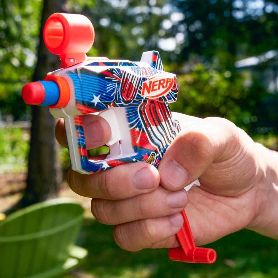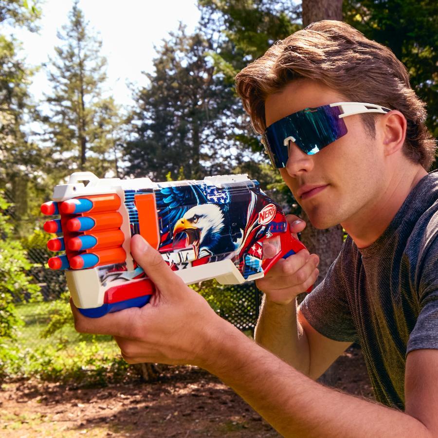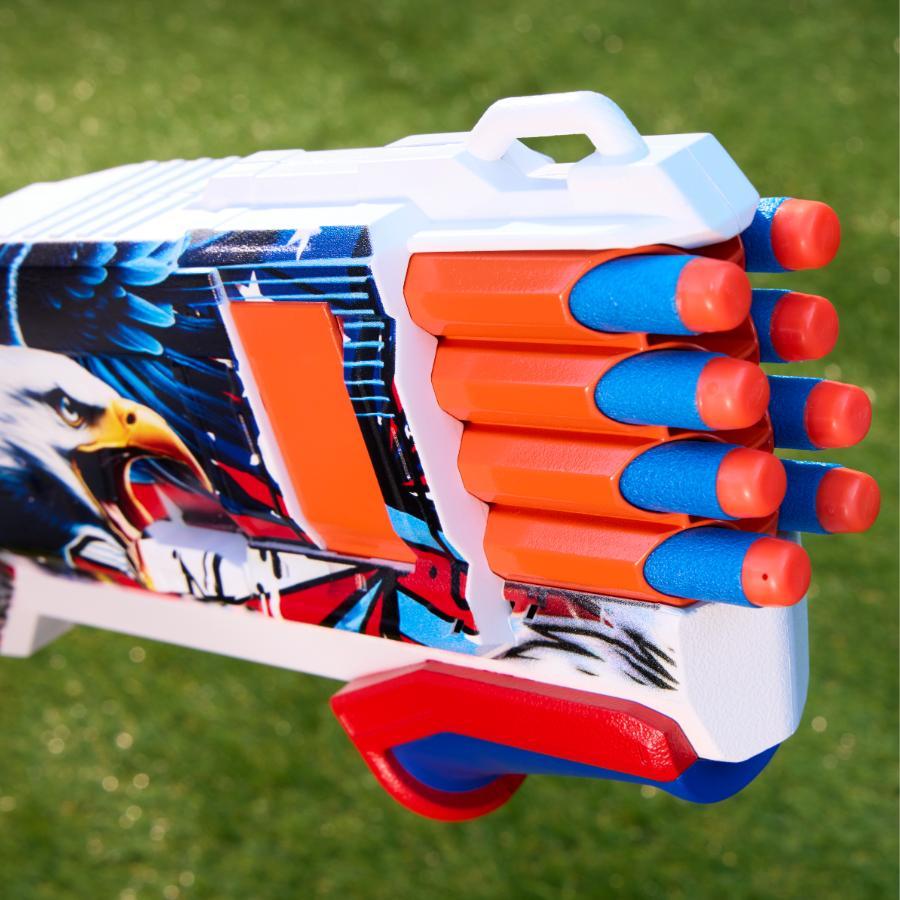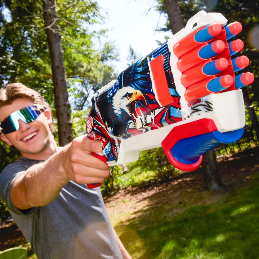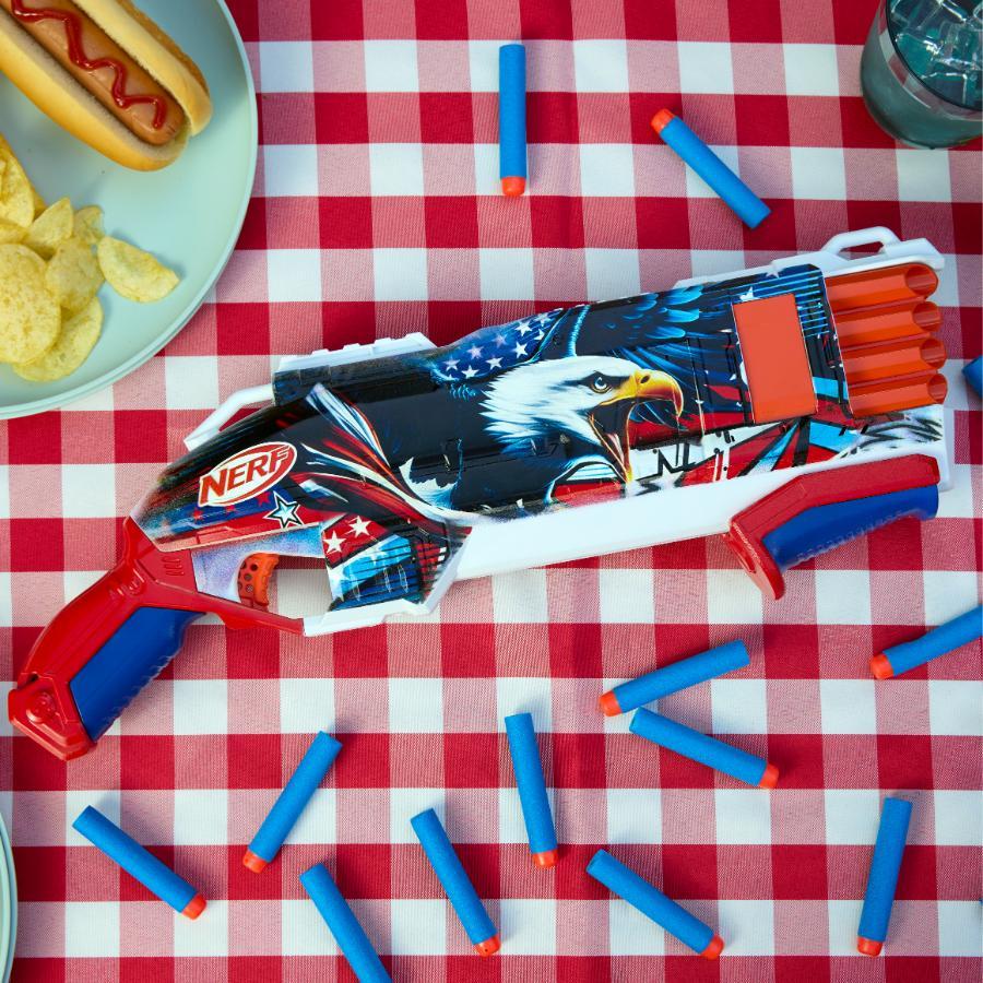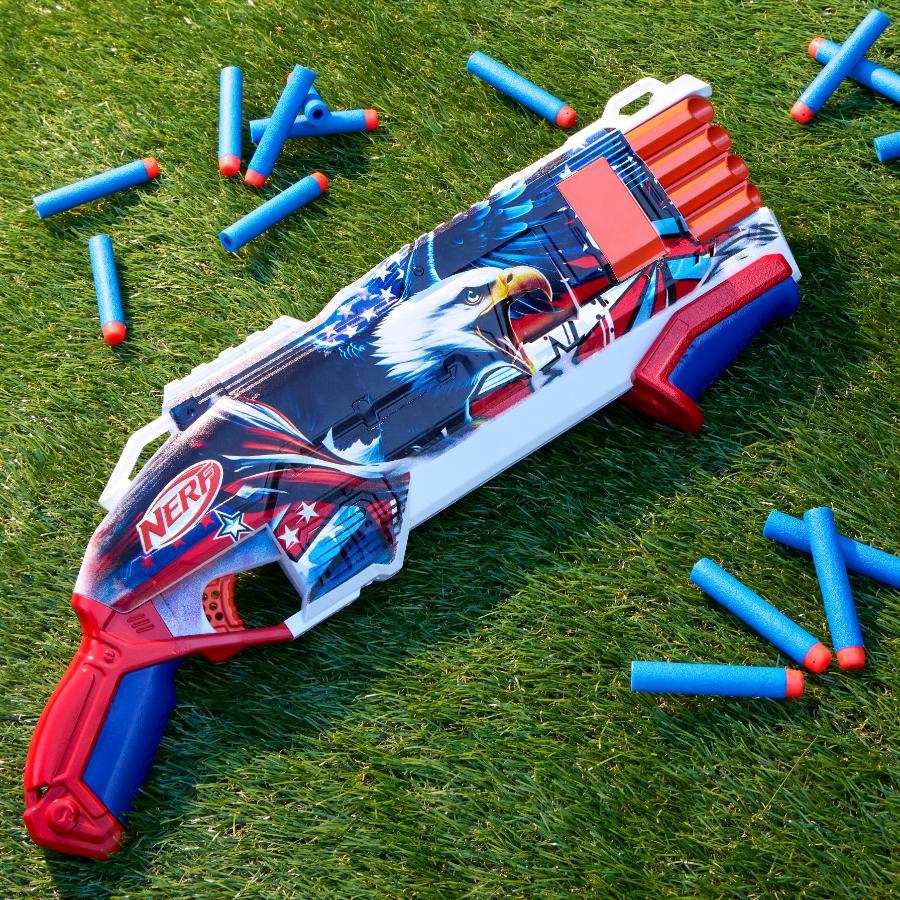 Red, white and blast! Celebrate America’s 250th birthday with this special NERF Elite Stars & Stripes Eagle dart blaster. Put your patriotic spirit front and center with this red, white, and blue blaster to mark the signing of the Declaration of Independence 250 years ago. The blaster’s colorful decorations are perfect for America’s big birthday bash. The blaster has an 8-dart capacity and fires 2 darts at a time with pump action priming. Send all 8 darts flying in quick succession with slam fire action. It includes 16 Elite foam darts, giving you additional darts for reloads. It’s perfect for July 4th gatherings with family and friends to blast into fun outdoor NERF battles in the backyard. To play, front load 8 darts, move the priming handle backward and forward, and pull the trigger. For slam fire, hold down the trigger as you pump the priming handle. Eyewear recommended (not included). No batteries required.